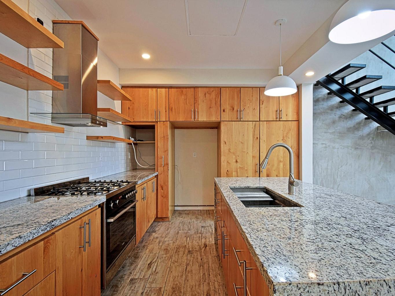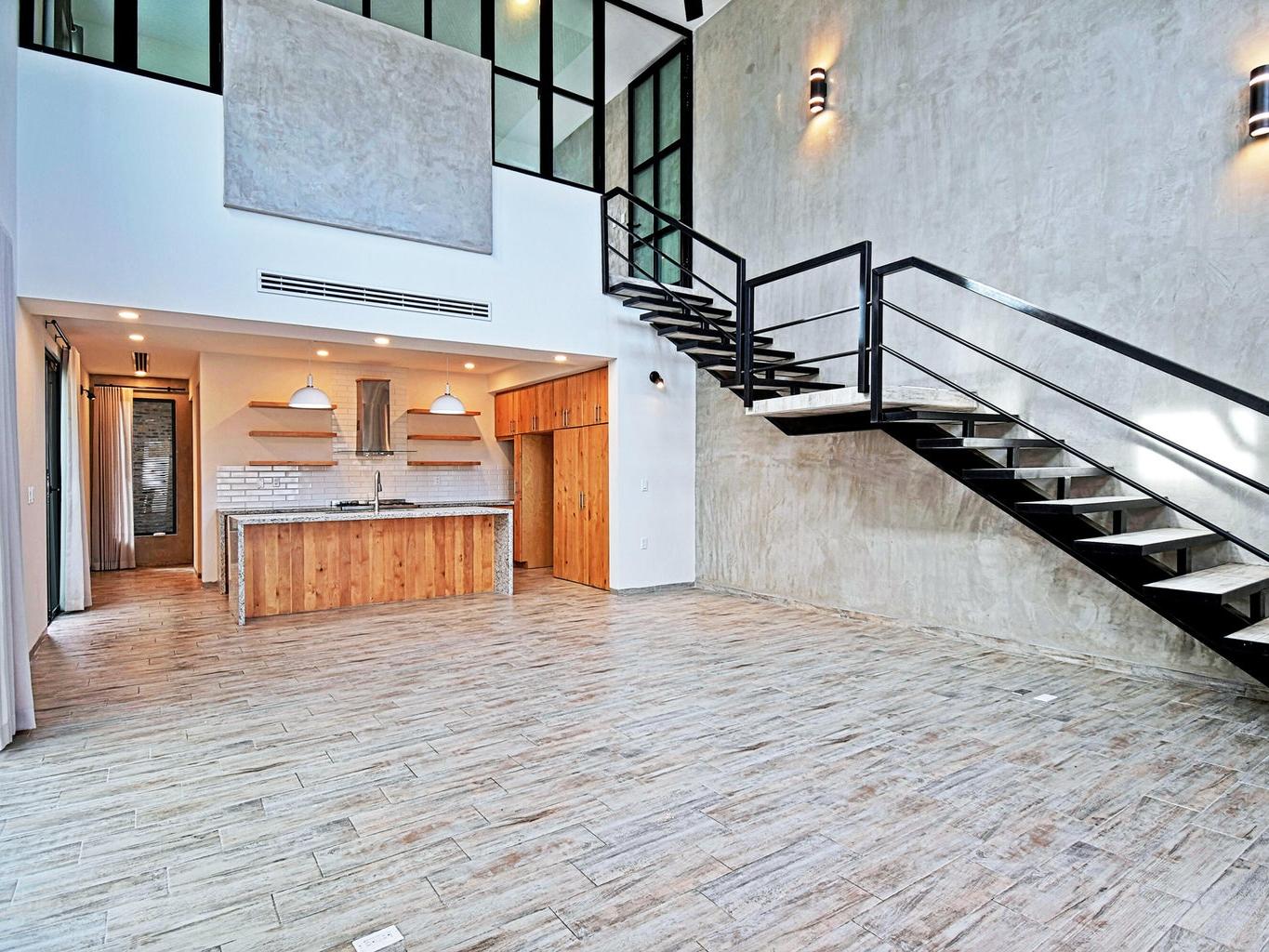Inside, the main living space offers high ceilings, a modern concrete accent wall, and a dramatic 10-ft reversible ceiling fan.