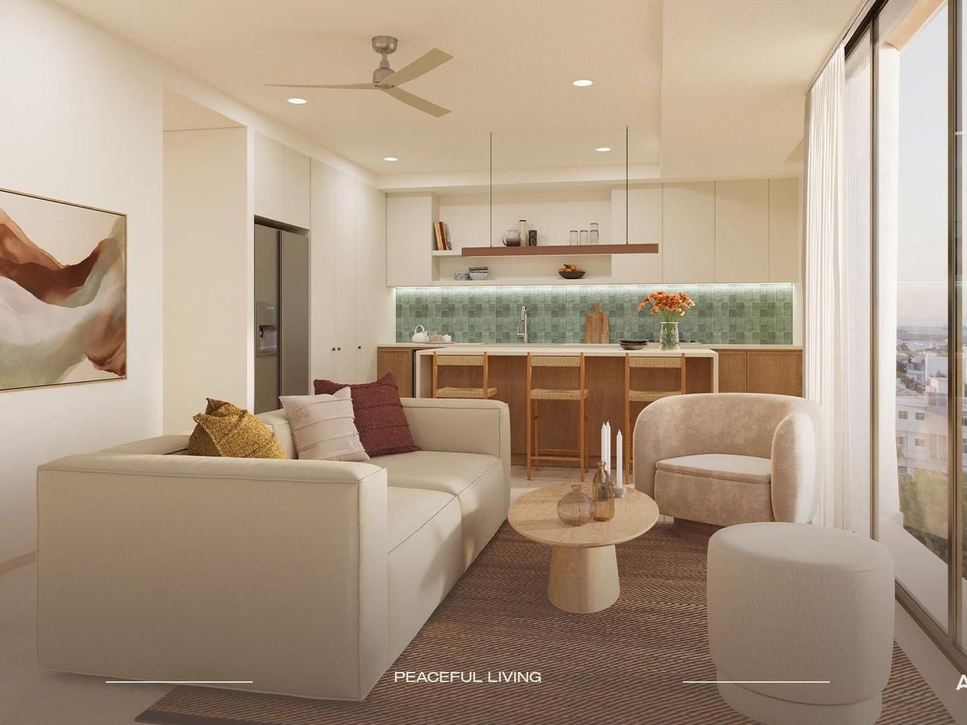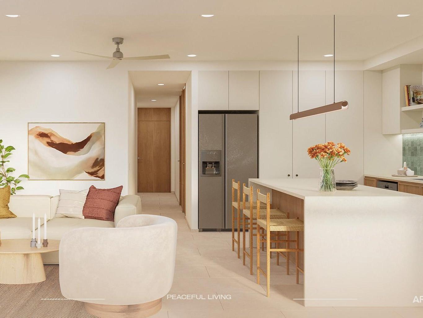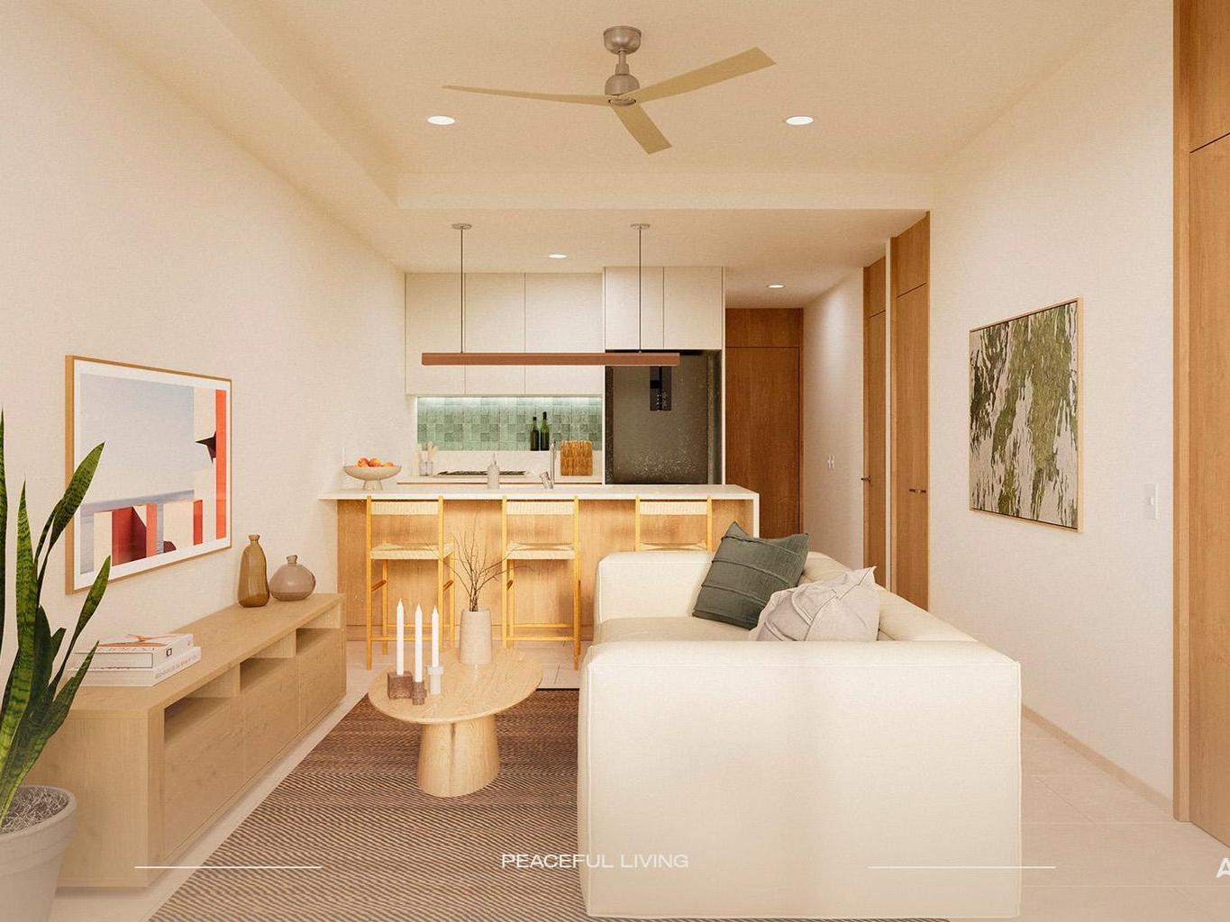 Architecture and interiors follow a warm, modern coastal style: large windows, neutral off-white walls, Egeo Castello ceramic floors, natural-tone wood carpentry, quartz kitchen countertops and marble bathroom vanities, creating bright, fresh and timeless spaces. Each unit is delivered with minisplit A/C, ceiling fans, champagne-tone interior window.