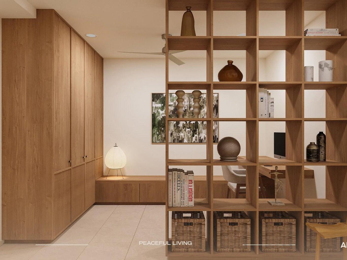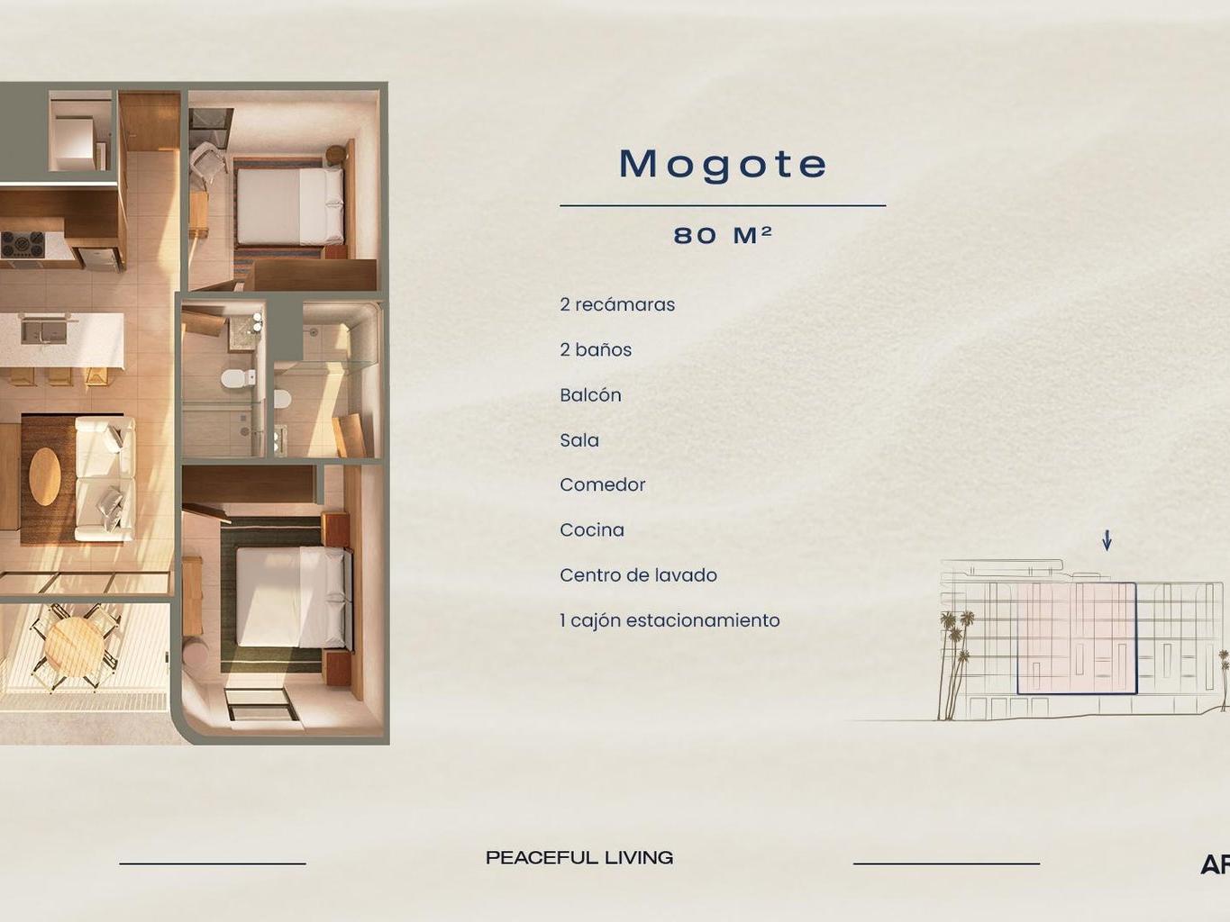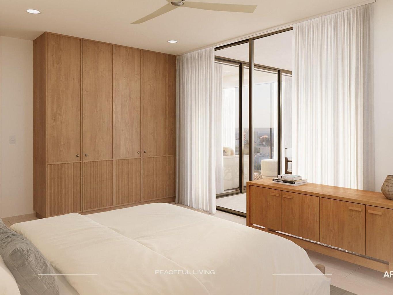 Architecture and interiors follow a warm, modern coastal style: large windows, neutral off-white walls, Egeo Castello ceramic floors, natural-tone wood carpentry, quartz kitchen countertops and marble bathroom vanities, creating bright, fresh and timeless spaces. Each unit is delivered with minisplit A/C, ceiling fans, champagne-tone interior window.
