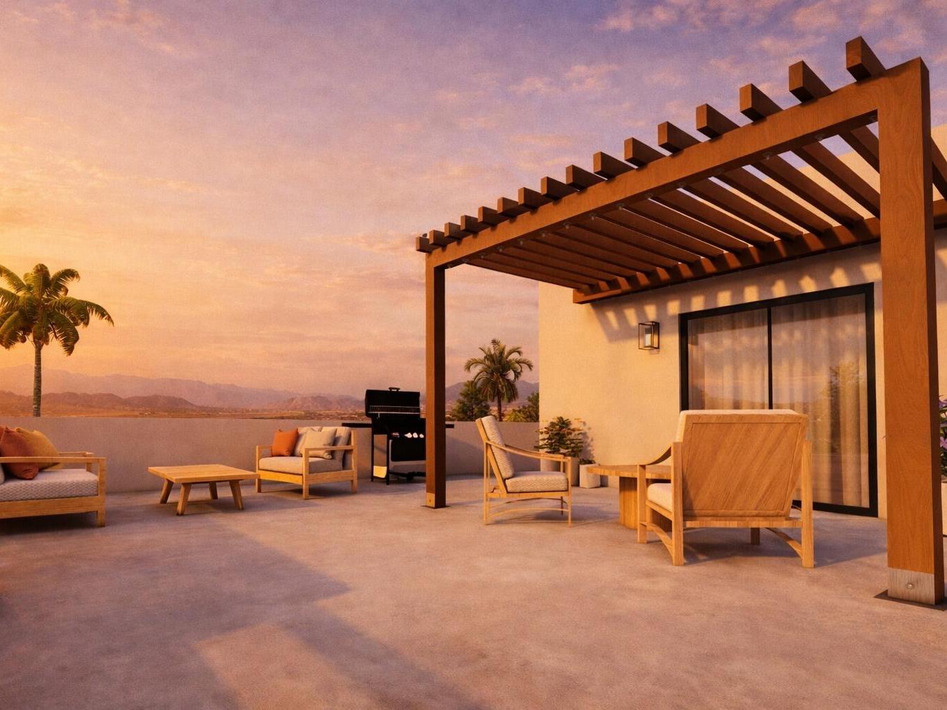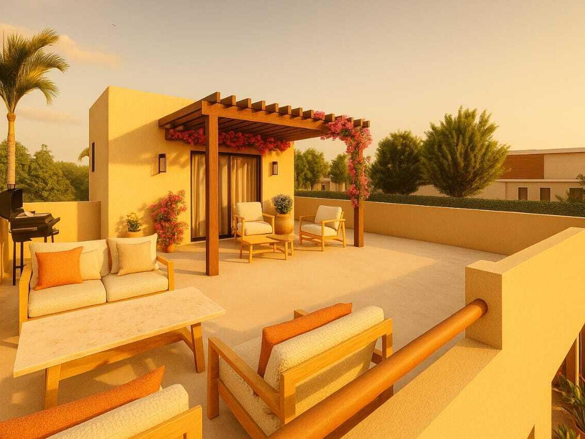 The home features 3 spacious bedrooms, 3 full bathrooms, and 2 levels, plus access to a rooftop perfect for enjoying stunning sunsets. It also includes patio and terrace areas ideal for relaxing or entertaining.