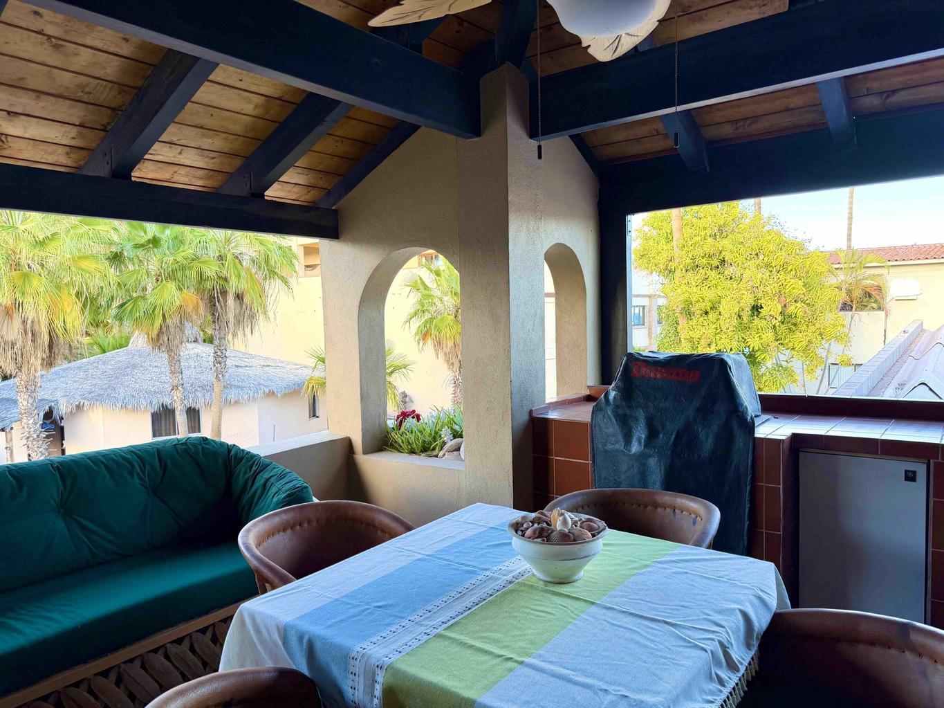 Up on the third floor a tiled, ramada-covered terrace offers stunning sea, island and mountain views.