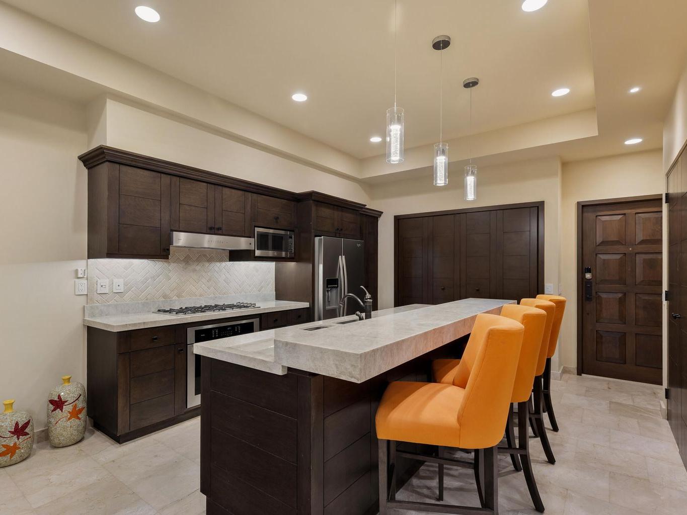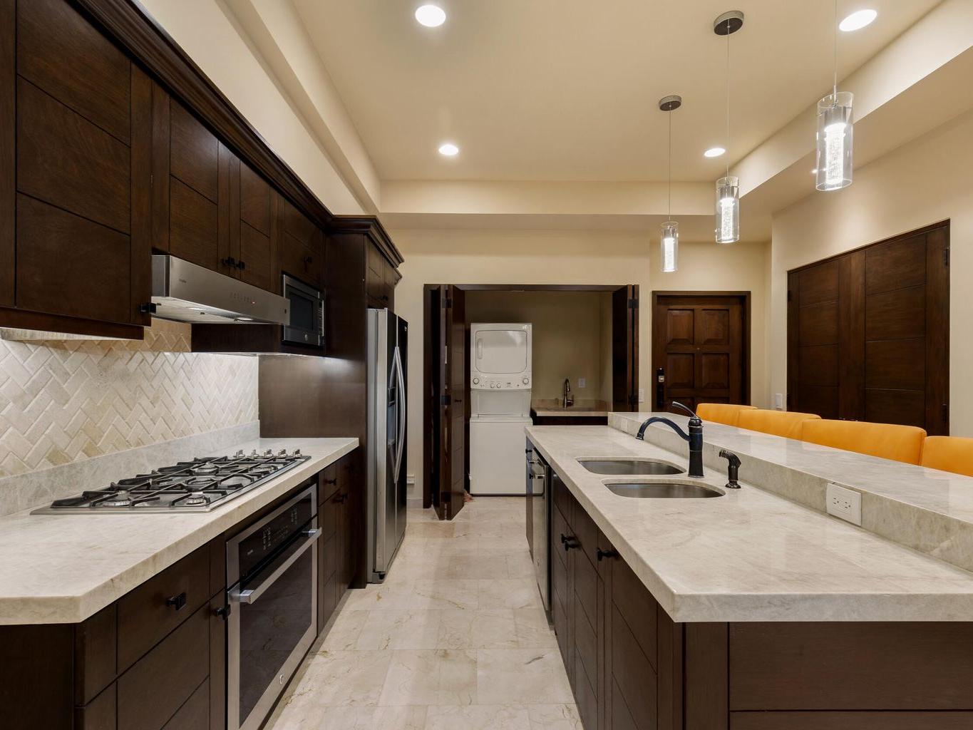 The kitchen is appointed with Taj Mahal countertops, GE Profile appliances, and refined finishes. Travertine floors and bathrooms add to