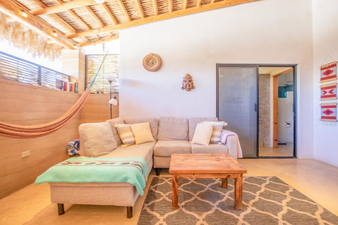 Discover Casa Tierra y Cielo (Casita 61), a beautifully crafted 2-bedroom, 2-bathroom home located in the sought-after community of Villas de Cerritos Beach. Just minutes from the pristine shores and world-class surf of Cerritos Beach, this inviting residence offers 947.11 sq. ft. of thoughtfully designed living space, seamlessly blending comfort, style, and functionality.
