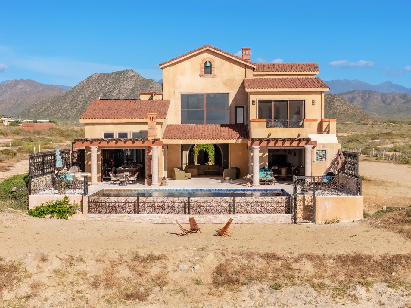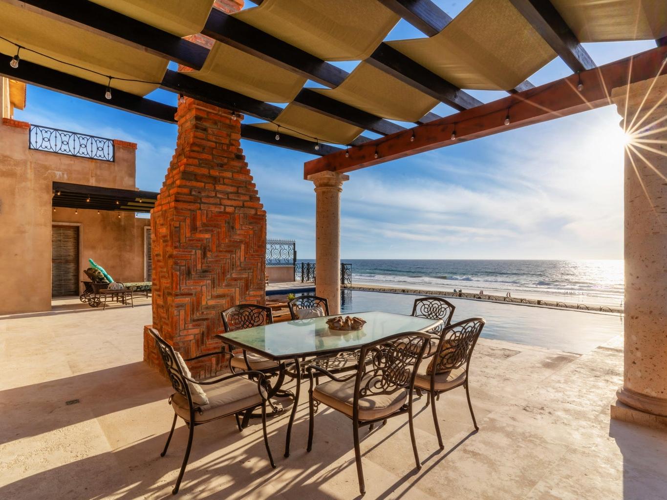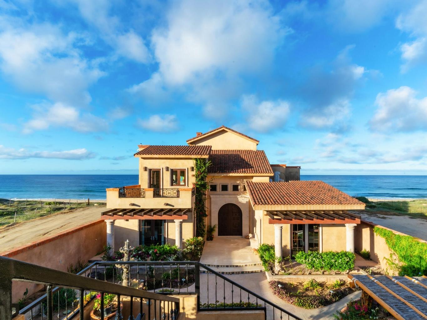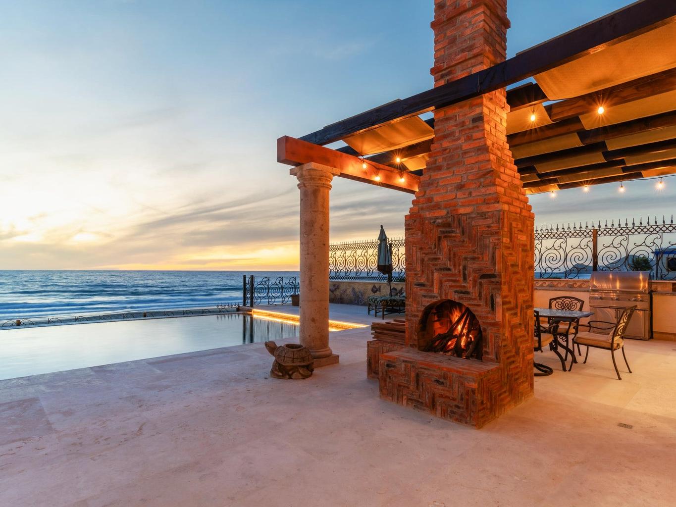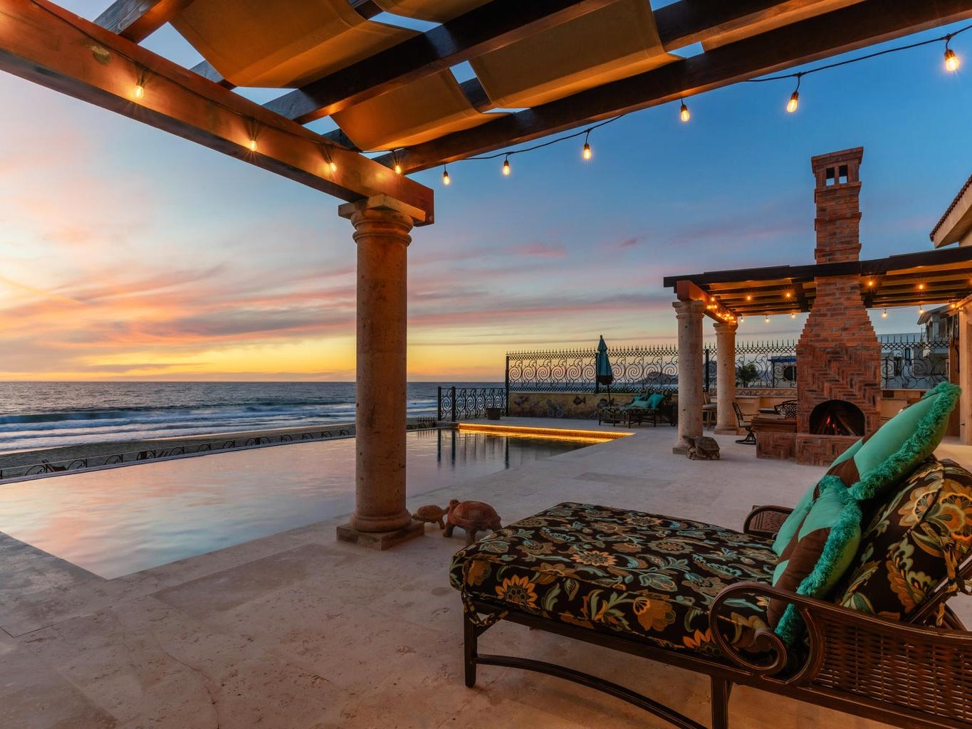 Oceanfront hacienda-style estate perched above Cerritos Beach in the planned community of Tortuga del Sol, offering unobstructed ocean views and expansive indoor-outdoor living. The property is centered around an ocean-front terrace with an infinity-edge pool, multiple pergola-covered lounge areas, outdoor dining spaces, fireplaces, and a built-in grill. Traditional construction elements include natural stone columns, hand-laid brick, arched masonry details, and exposed wood beam ceilings throughout. Interior spaces feature a double-height main living room with fireplace and mezzanine balcony, a functional chef's kitchen with custom cabinetry and island, and seamless access to terraces and balconies.