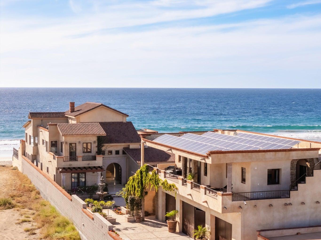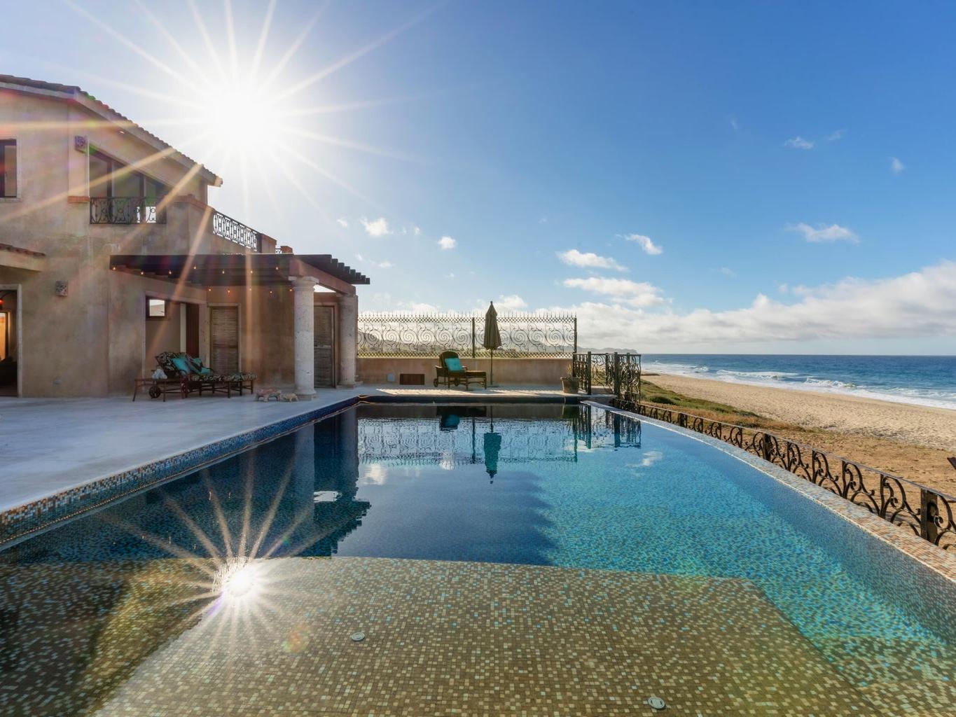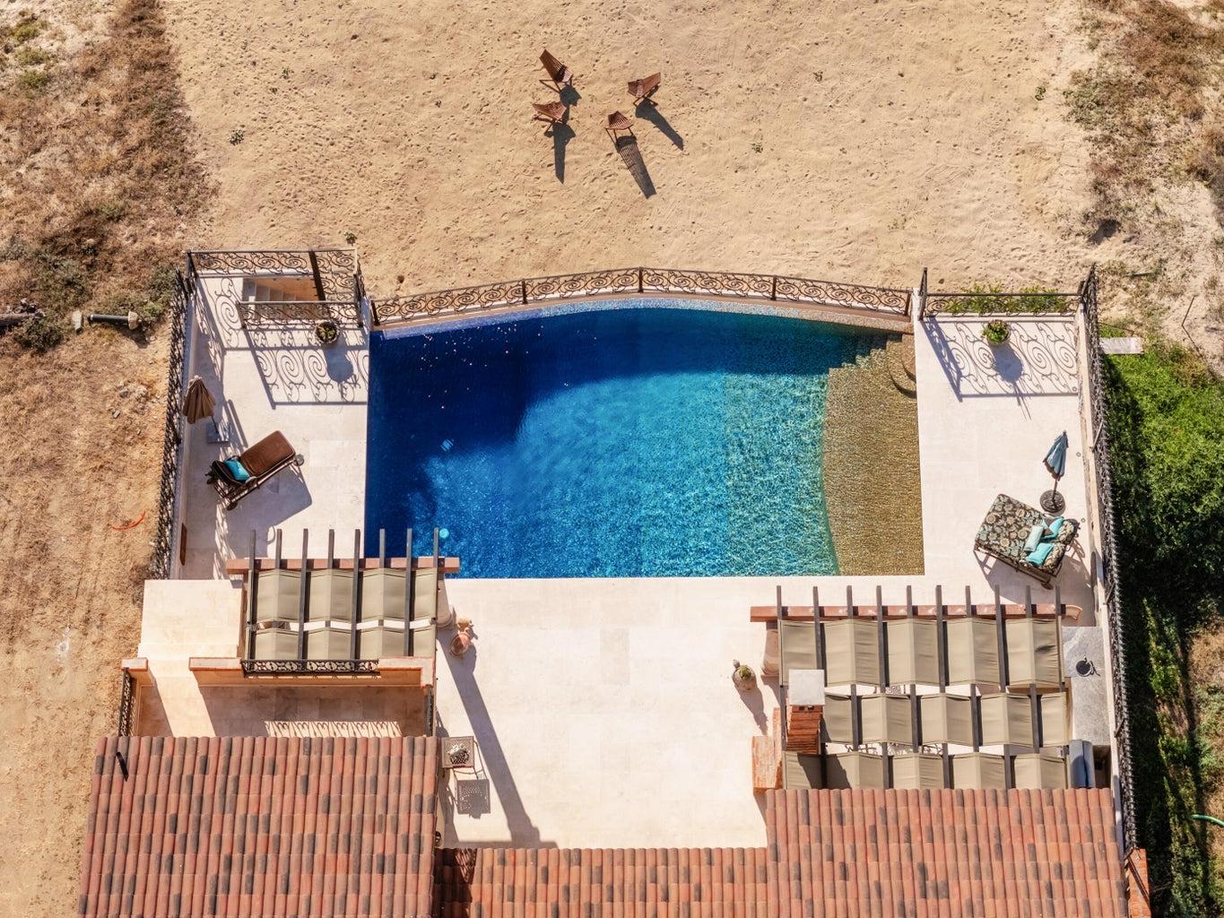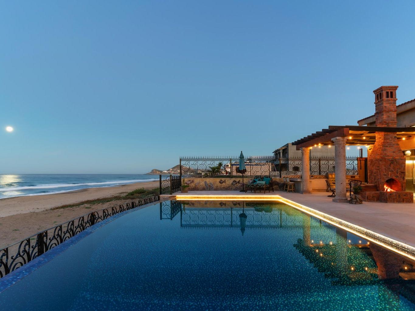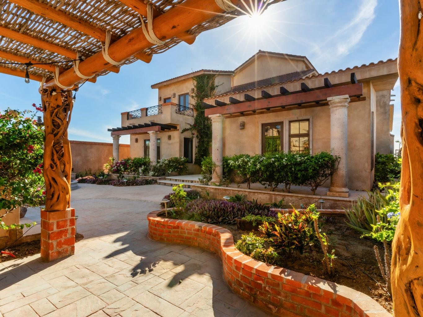 Oceanfront hacienda-style estate perched above Cerritos Beach in the planned community of Tortuga del Sol, offering unobstructed ocean views and expansive indoor-outdoor living. The property is centered around an ocean-front terrace with an infinity-edge pool, multiple pergola-covered lounge areas, outdoor dining spaces, fireplaces, and a built-in grill. Traditional construction elements include natural stone columns, hand-laid brick, arched masonry details, and exposed wood beam ceilings throughout. Interior spaces feature a double-height main living room with fireplace and mezzanine balcony, a functional chef's kitchen with custom cabinetry and island, and seamless access to terraces and balconies.