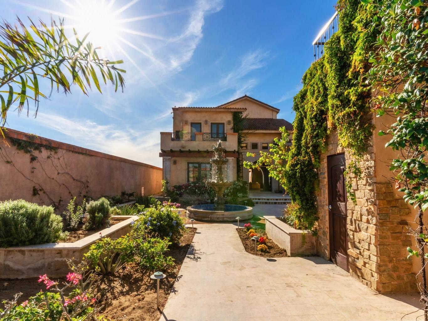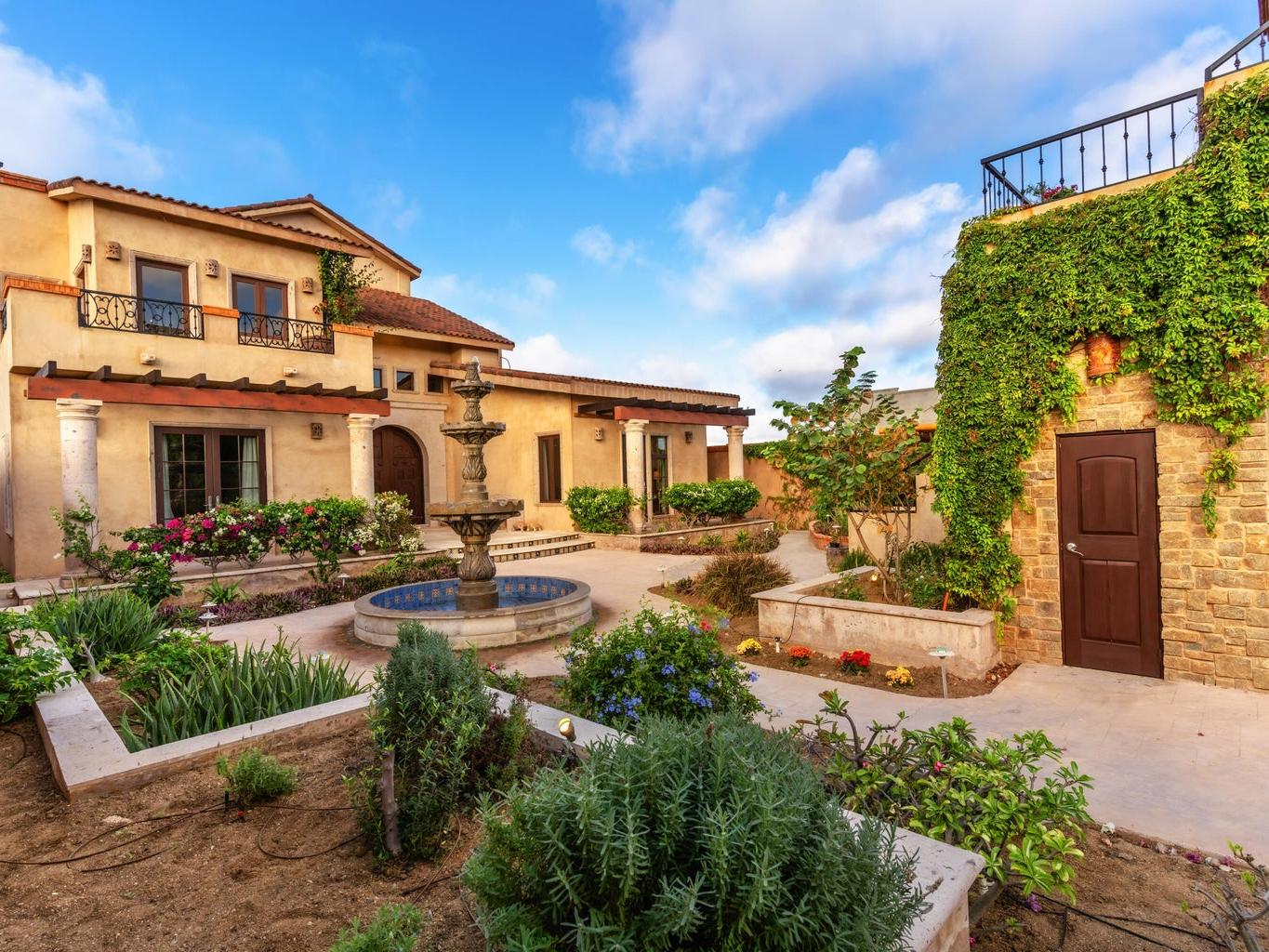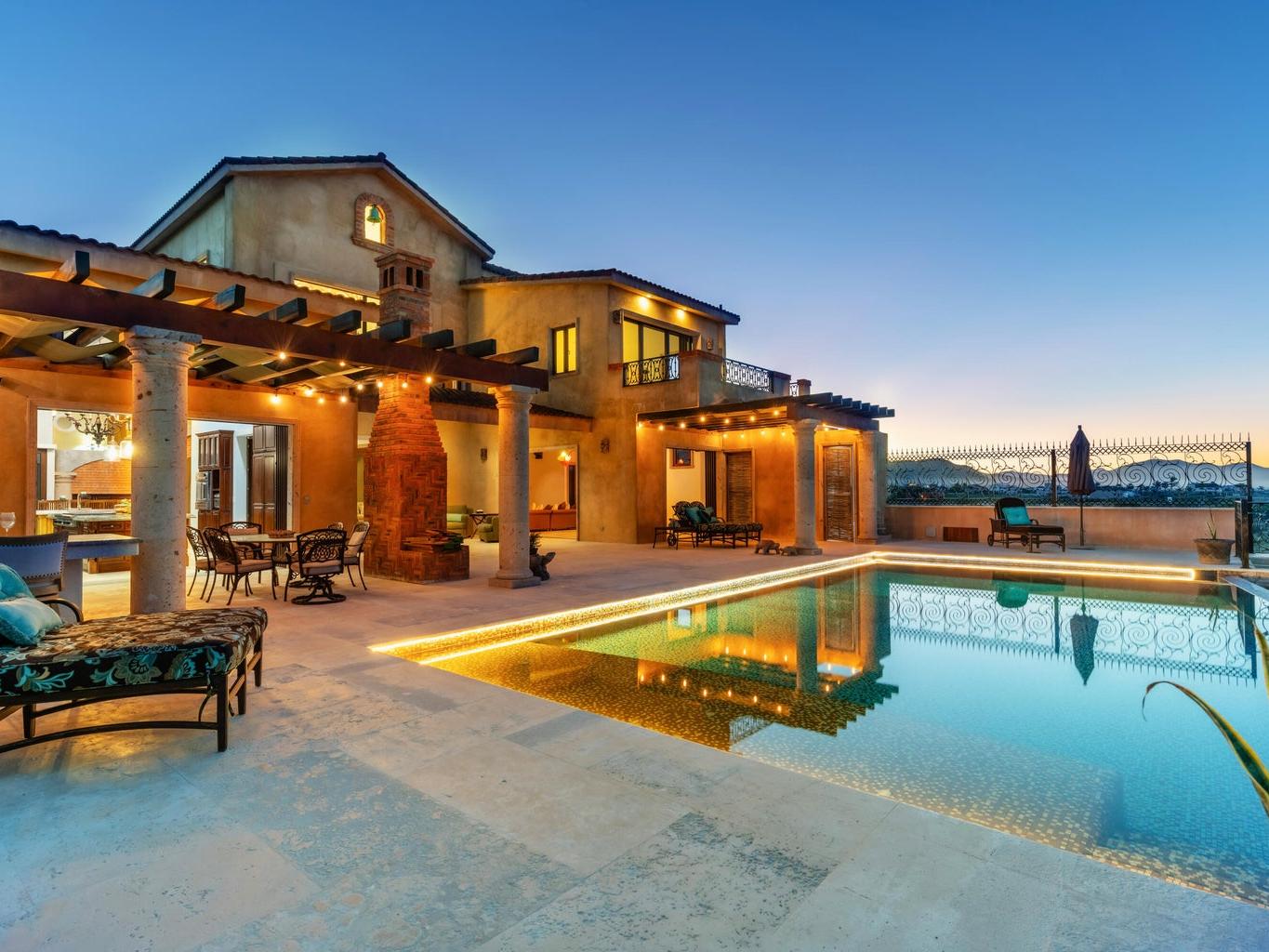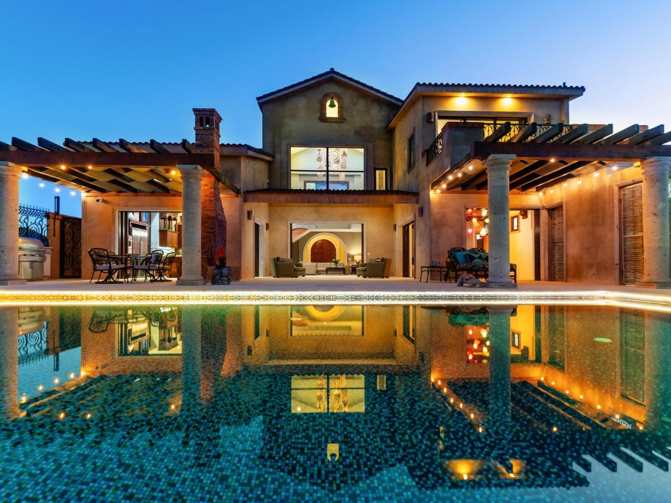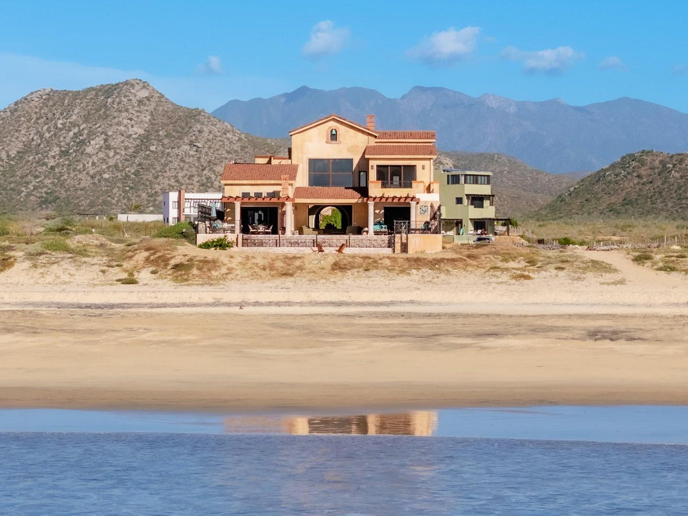Oceanfront hacienda-style estate perched above Cerritos Beach in the planned community of Tortuga del Sol, offering unobstructed ocean views and expansive indoor-outdoor living. The property is centered around an ocean-front terrace with an infinity-edge pool, multiple pergola-covered lounge areas, outdoor dining spaces, fireplaces, and a built-in grill. Traditional construction elements include natural stone columns, hand-laid brick, arched masonry details, and exposed wood beam ceilings throughout. Interior spaces feature a double-height main living room with fireplace and mezzanine balcony, a functional chef's kitchen with custom cabinetry and island, and seamless access to terraces and balconies.