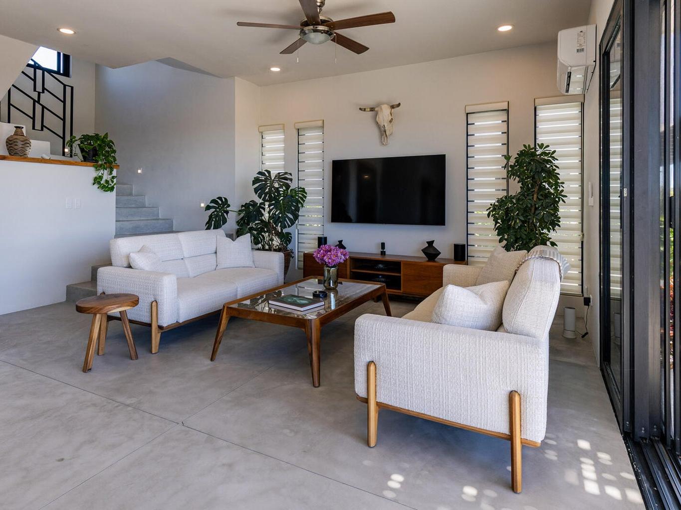 Fully furnished modern villa in Villas Mar del Sol 1, an exclusive boutique community of only four residences in El Posito, near Las Tunas Downtown. 3 bedrooms and 4 baths designed for effortless coastal living, filled with natural light and open flow. Stunning Pacific Ocean and mountain views enjoyed from living areas and bedrooms. Secure gated access and beautifully maintained common areas with pool, Jacuzzi, sundeck and shaded bar create a private resort style atmosphere. Parking and equipped laundry room included. Minutes to the beach and close to downtown. Turnkey and ready to enjoy.