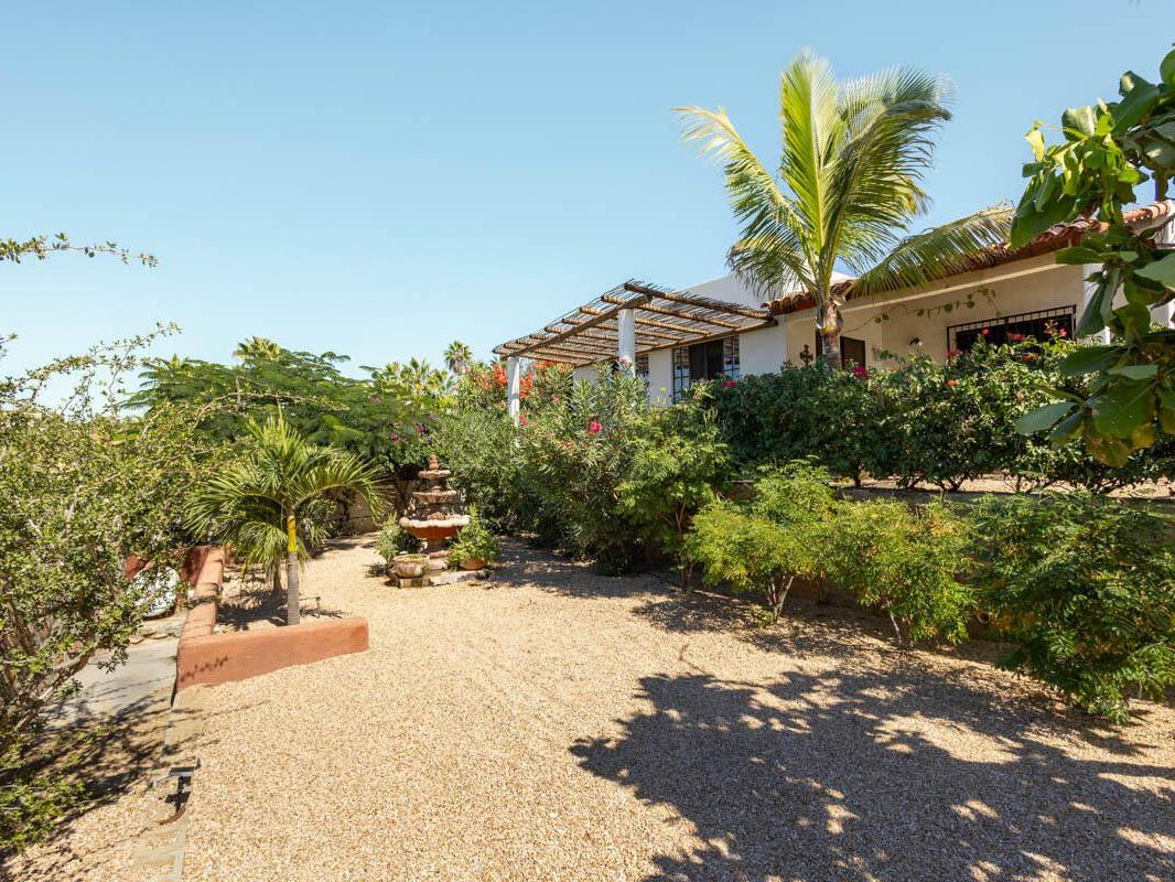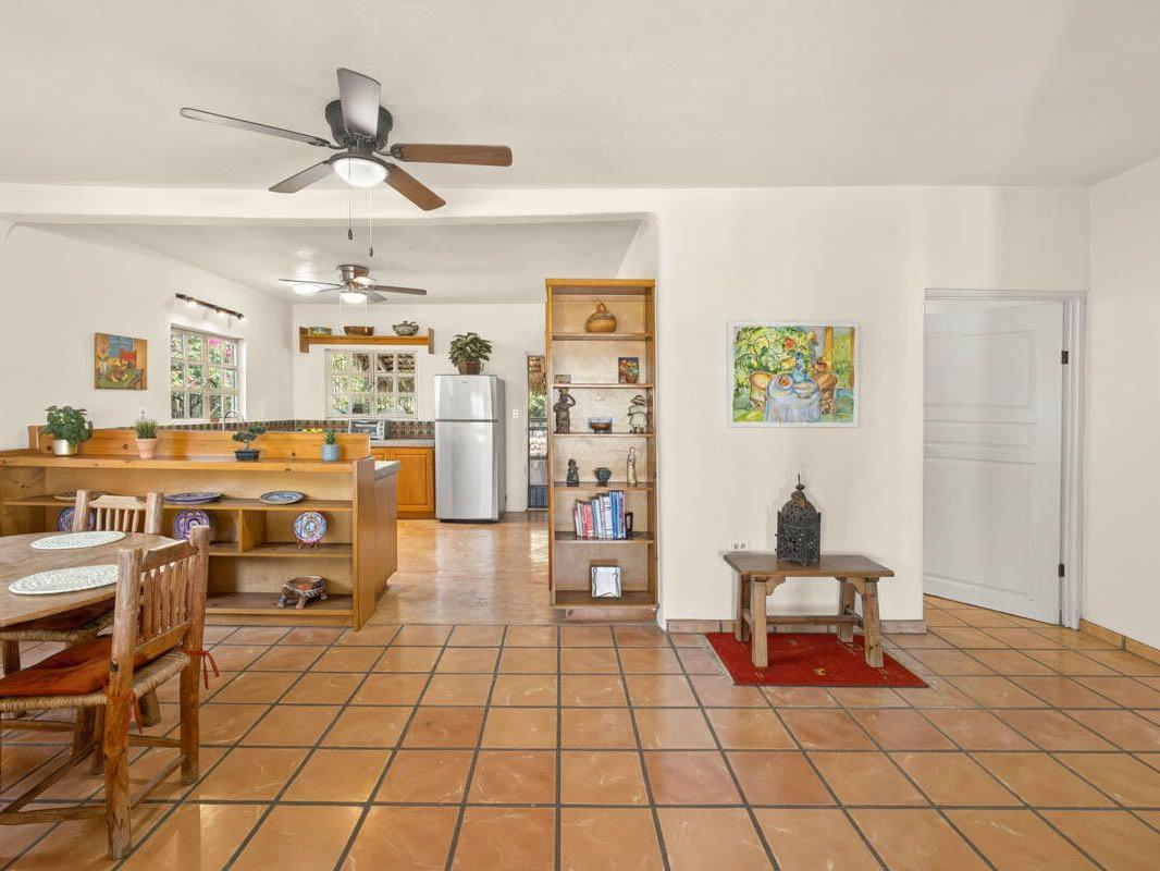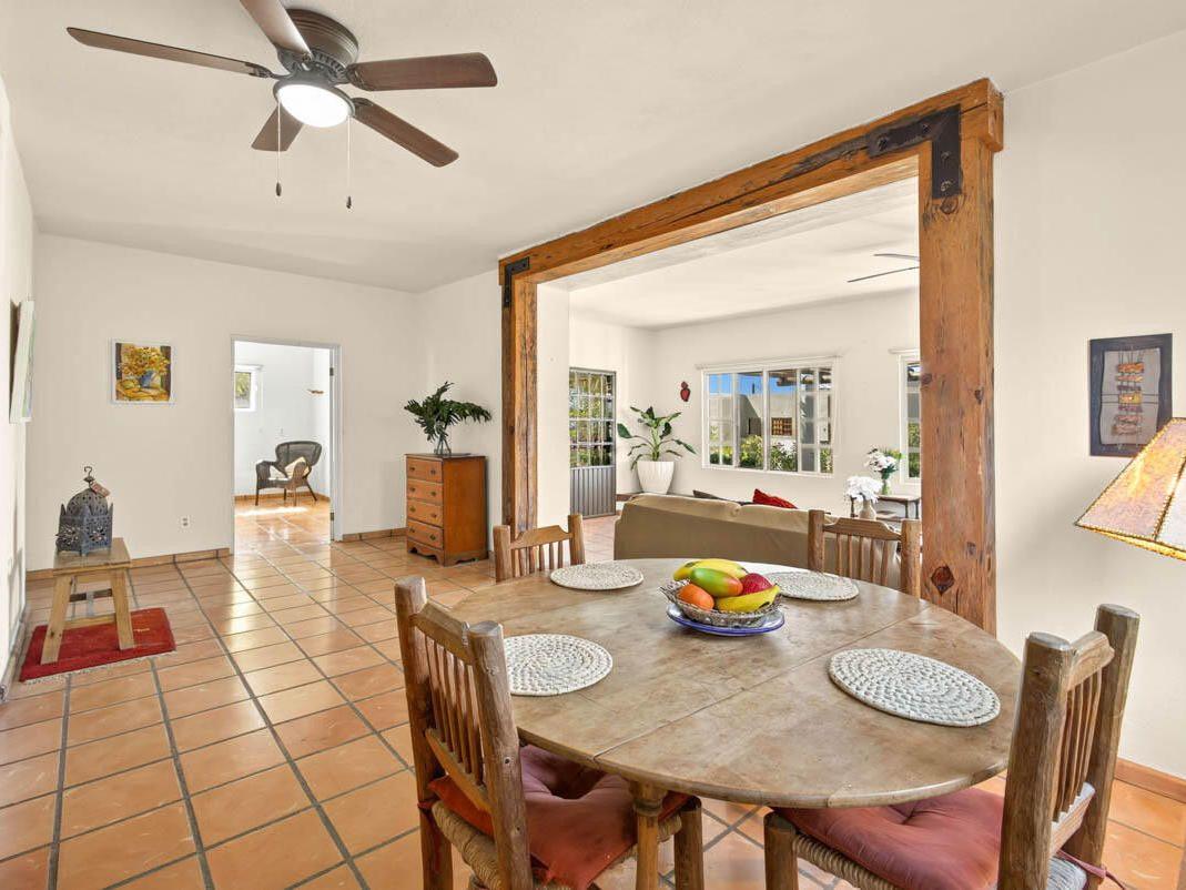 An inviting outdoor dining space under a traditional palapa, perfect for hosting gatherings or enjoying quiet evenings al fresco. A full-size garage provides ample space for one vehicles and storage.