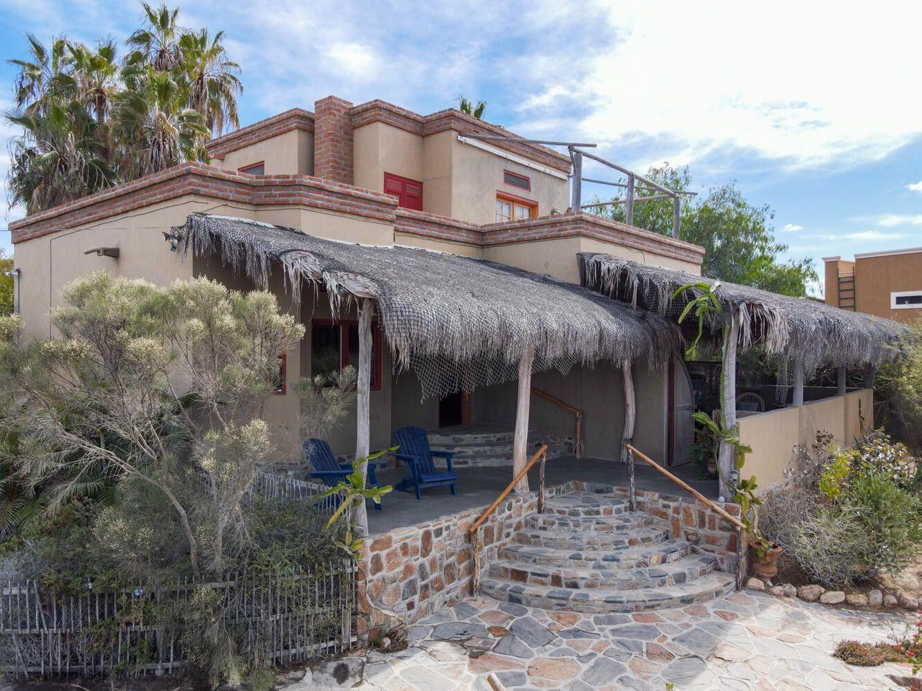 Very sweet 3 bedroom home located high on a ridge in Las Brisas neighborhood with expansive ocean views from inside the house, the kitchen, bedrooms, terraces and all over the gardens. Built by local builder Bruce Kramer, the style and feel of the home is anchored in comfortable and cozy Baja living. Inside the gates the first of many meandering rock pathways leads you to the main entrance flanked by a large ocean view terrace. Once inside the open plan kitchen and living room with gas fireplace greet you with ocean and garden views through the large wood windows. A spare bedroom with full bath and closet is off of the living room also with views to the gardens and ocean. A big wood door off of the kitchen leads to hidden back patio area and into more pathways and gardens.