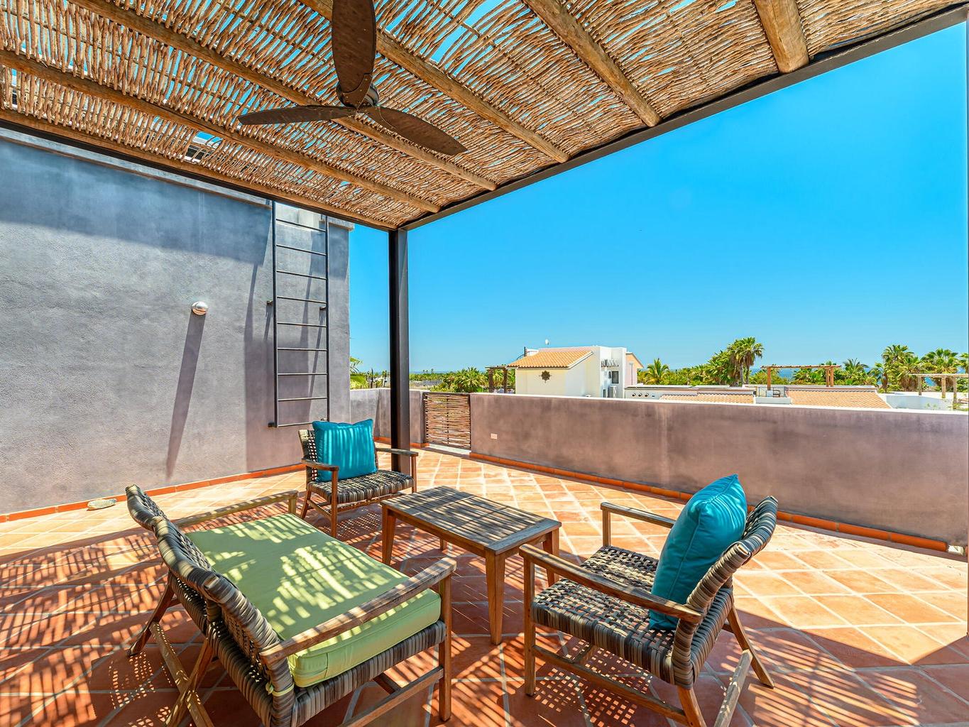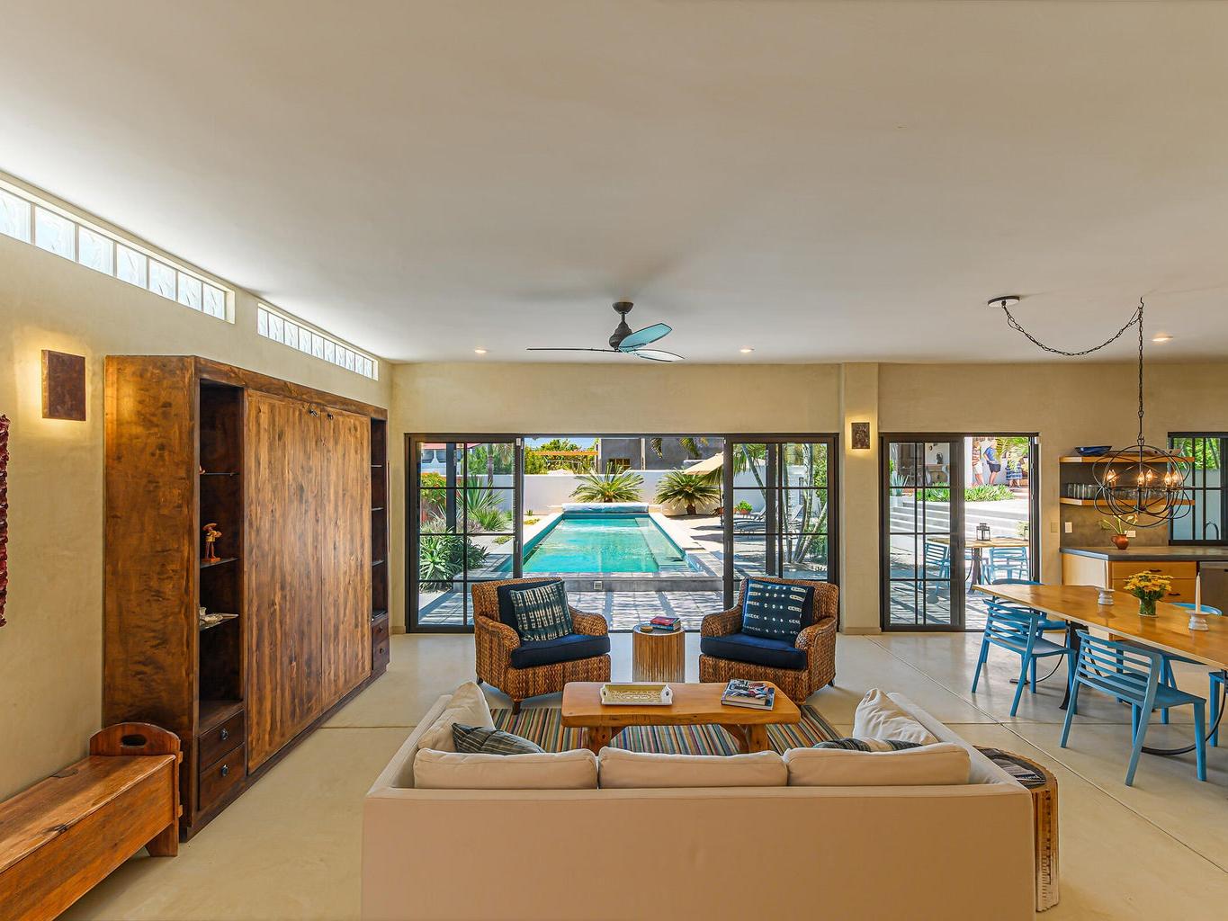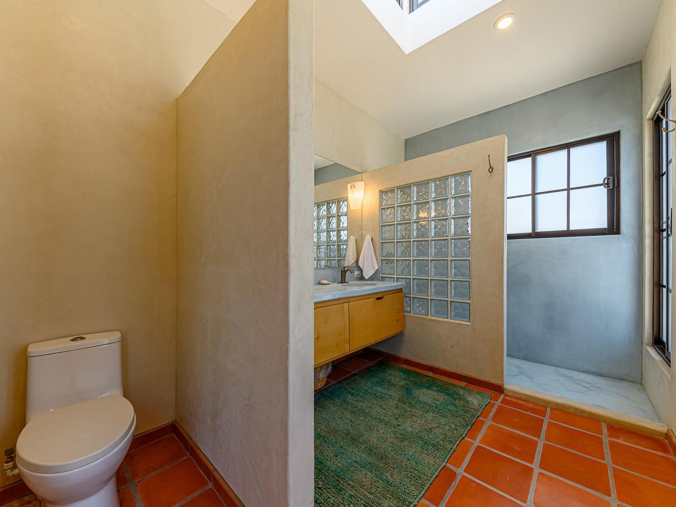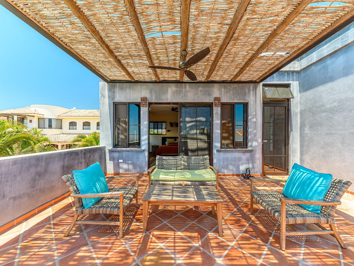 Meet Casa Azul, a delightful one-bedroom, two and one-half bath home located in the sought after Todos Santos neighborhood of Las Tunas. Discover a charming blend of contemporary design and modern furnishings with tasteful accents and rich, color infused walls throughout. Polished concrete floors and countertops, handcrafted sconces, media sombra patio covers and artisanal tiles leading you up the staircase remind you that you are in Mexico yet modern appliances and first class amenities abound. The cleverly hidden Murphy bed in the living area allows sleeping for two with the added convenience of a full bath steps away. Upstairs is the primary bedroom and bath with a spacious shaded patio featuring lovely ocean views.