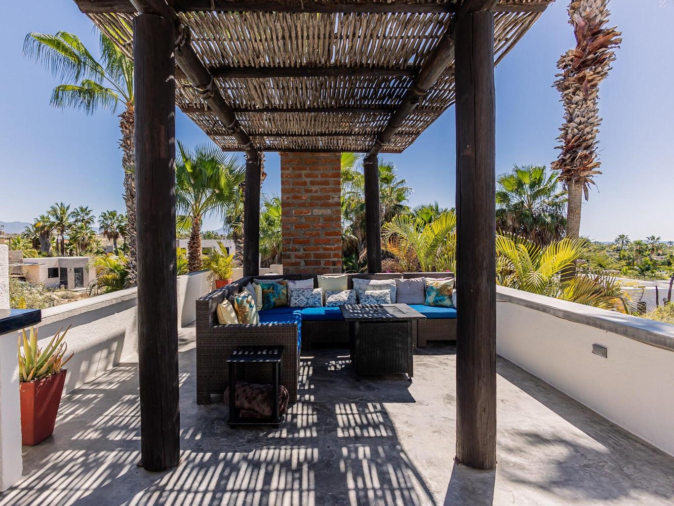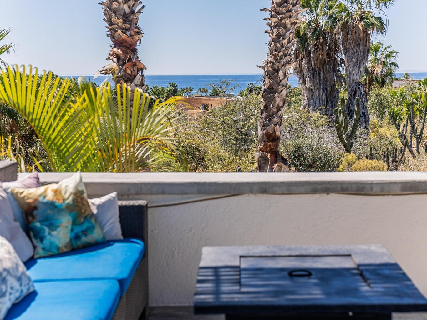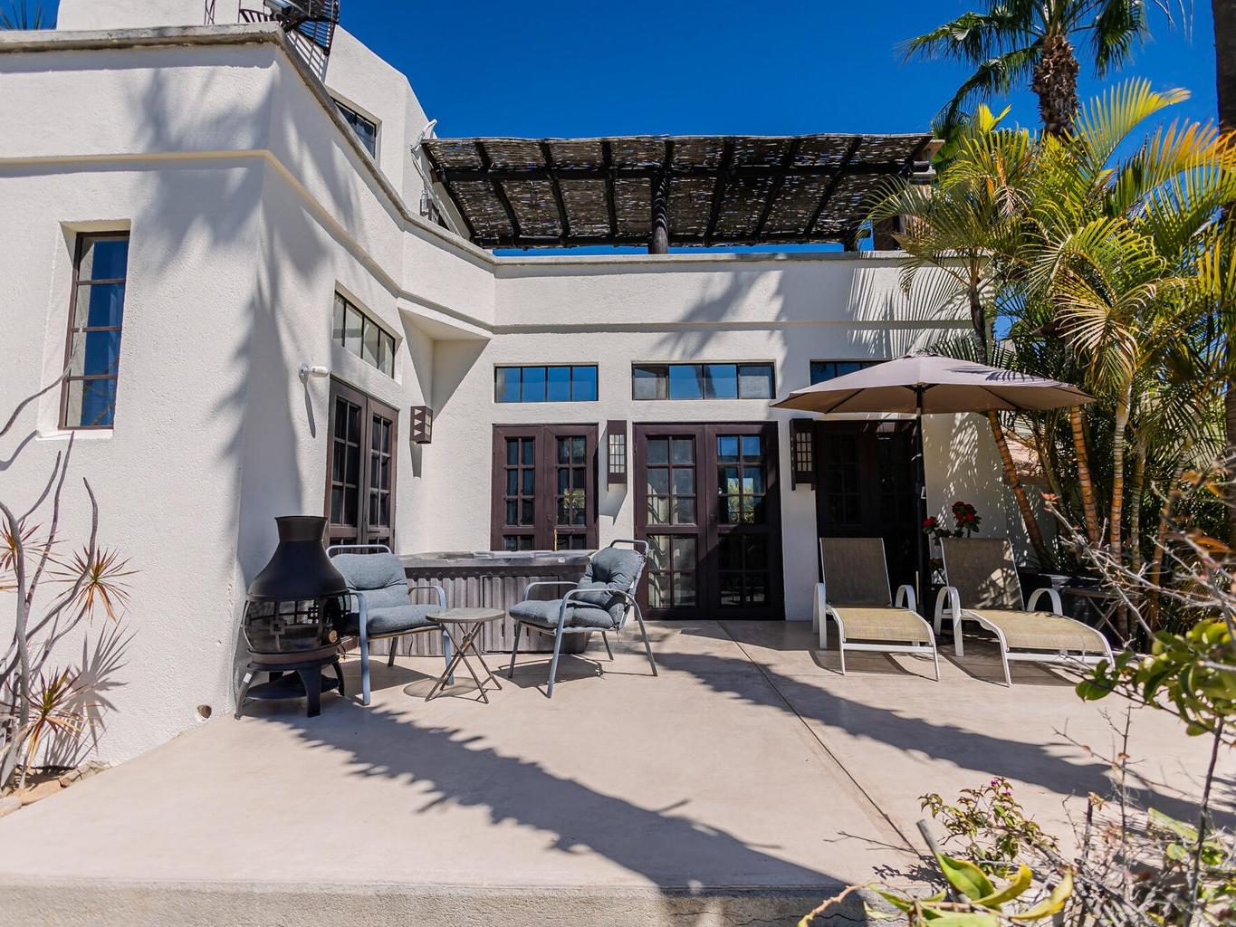 The patios function as an extension of the home, creating multiple zones for gathering, relaxing, and entertaining. Upstairs, a generous sectional invites long evenings of ocean and sunset views, warmed by a fire pit and connected by a spiral staircase to a rooftop deck ideal for whale watching or checking the surf at Pastora.