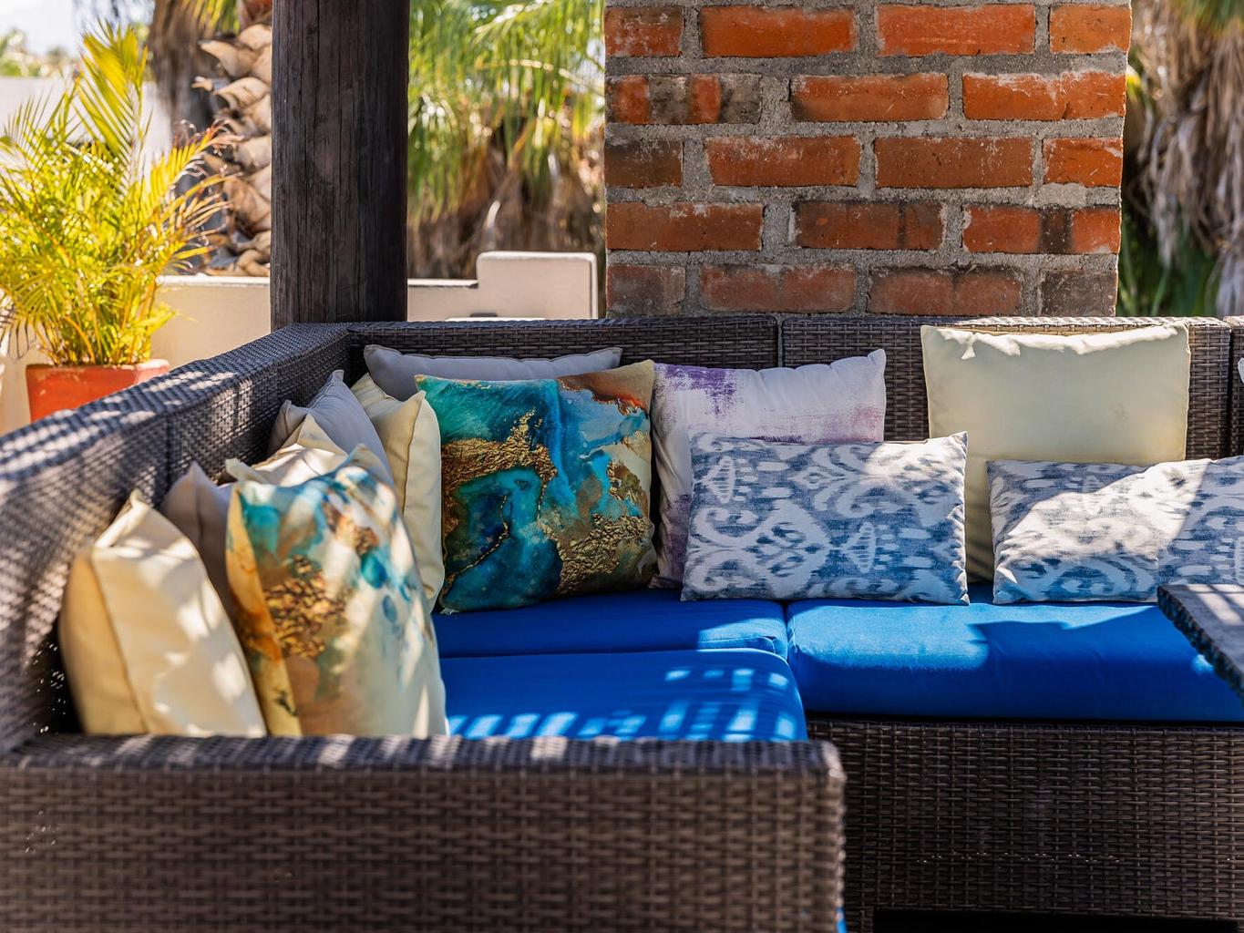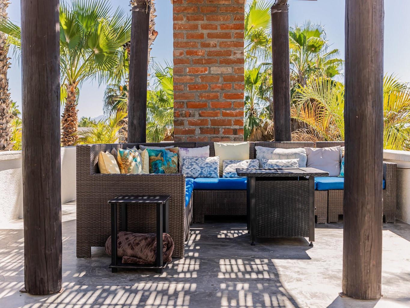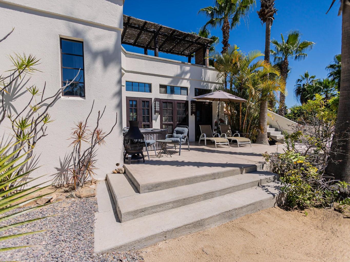 The patios function as an extension of the home, creating multiple zones for gathering, relaxing, and entertaining. Upstairs, a generous sectional invites long evenings of ocean and sunset views, warmed by a fire pit and connected by a spiral staircase to a rooftop deck ideal for whale watching or checking the surf at Pastora.