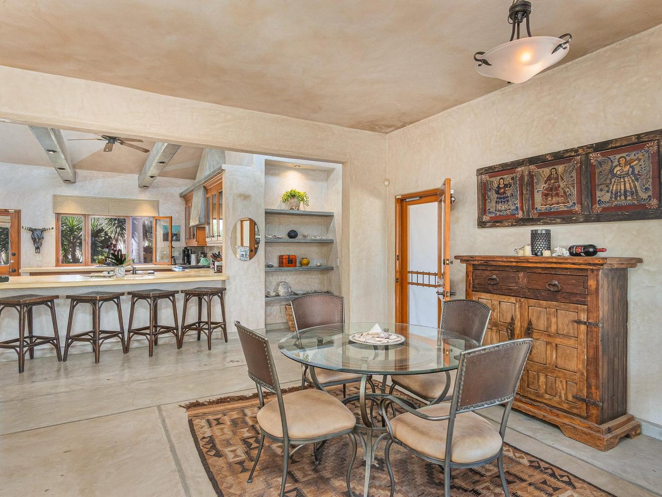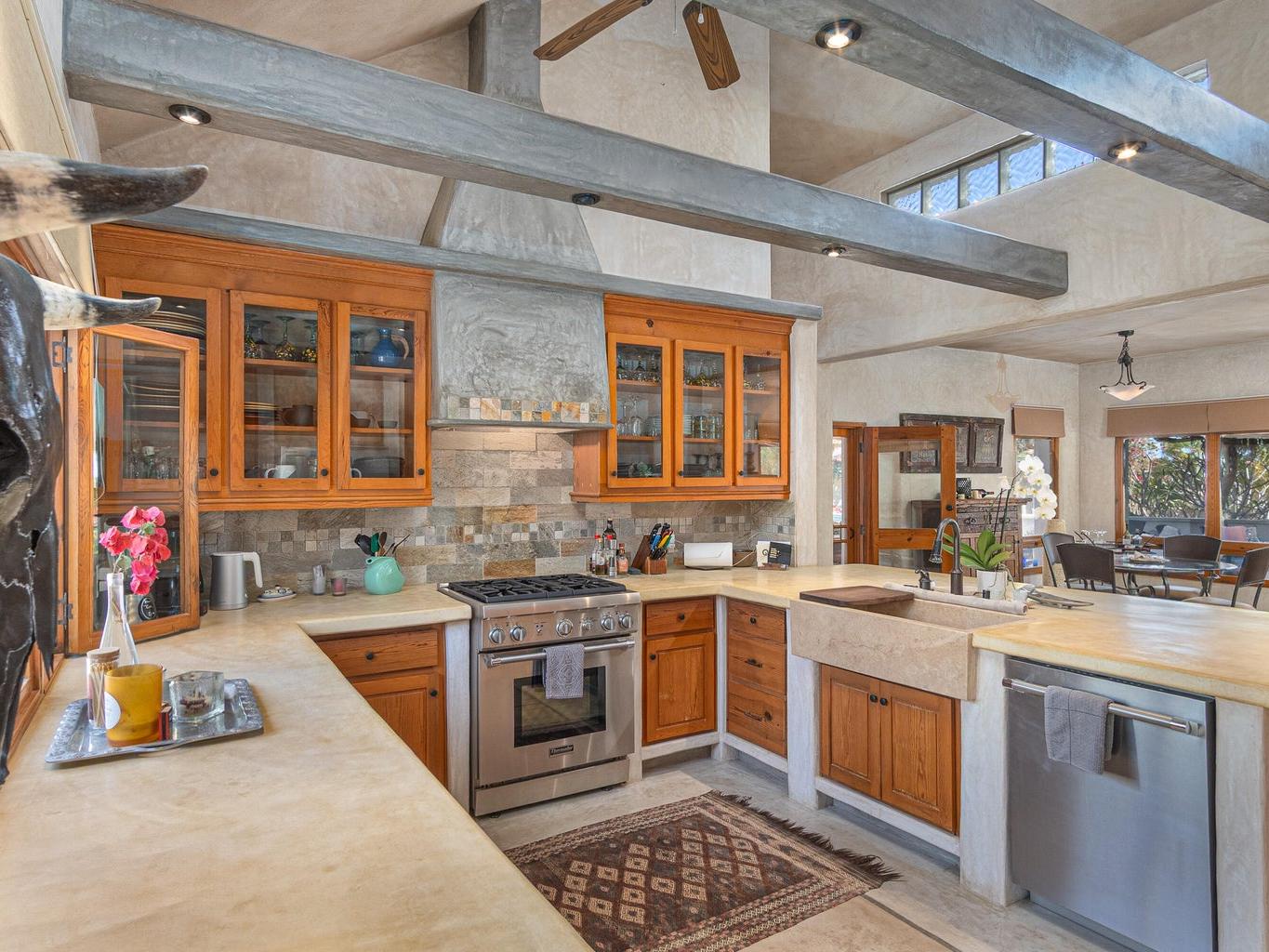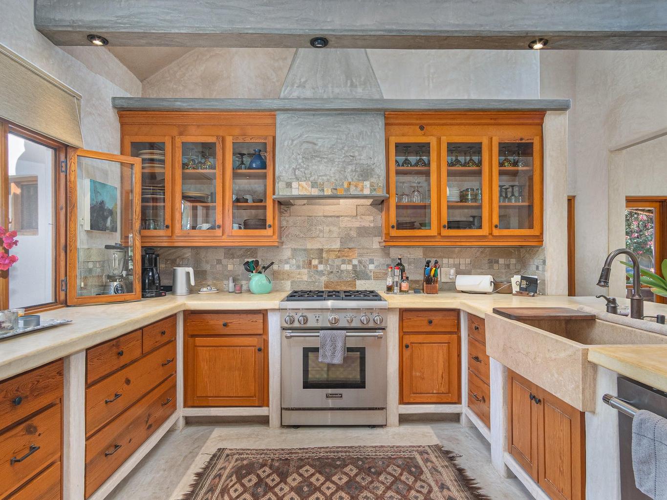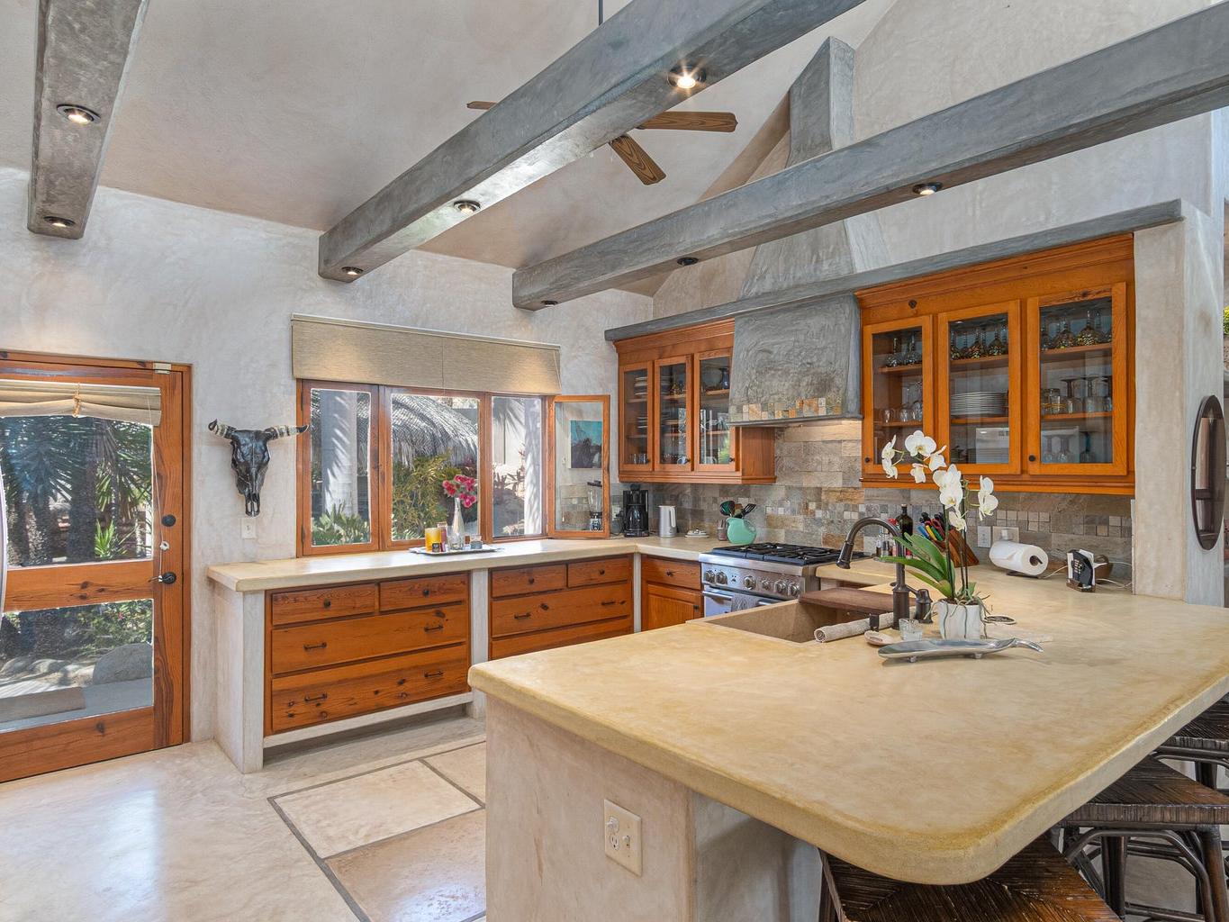 The interior features a chef's kitchen equipped with premium appliances, polished concrete countertops, and custom wood cabinetry. The home is furnished in a tasteful, classic style, offering turnkey elegance. The master suite serves as a private sanctuary with travertine marble, dual sinks, and a walk-in shower. All guest bedrooms include king-size beds and en-suite bathrooms, and are strategically located to ensure