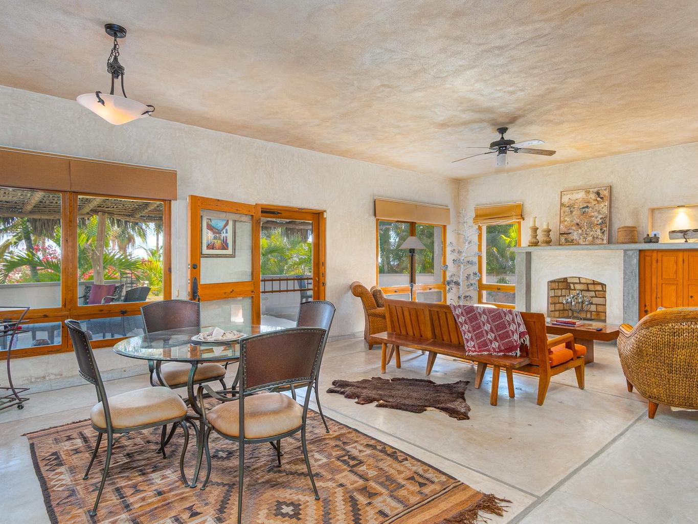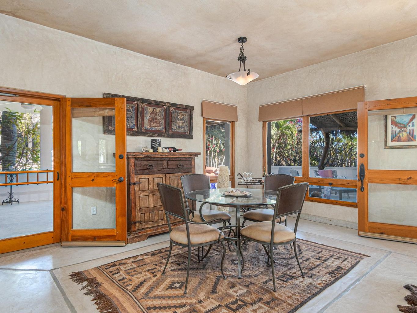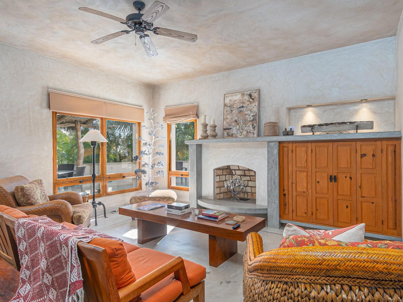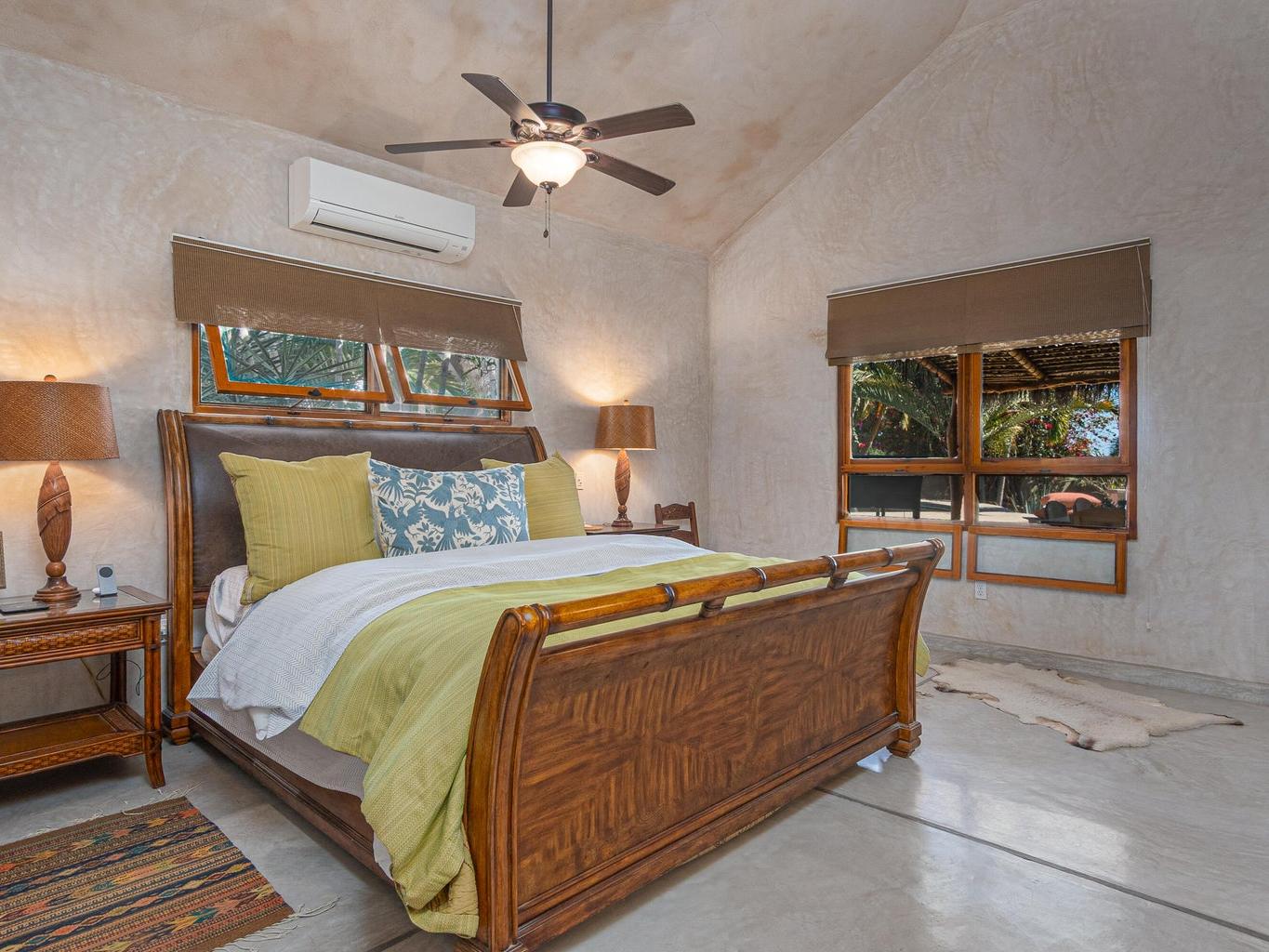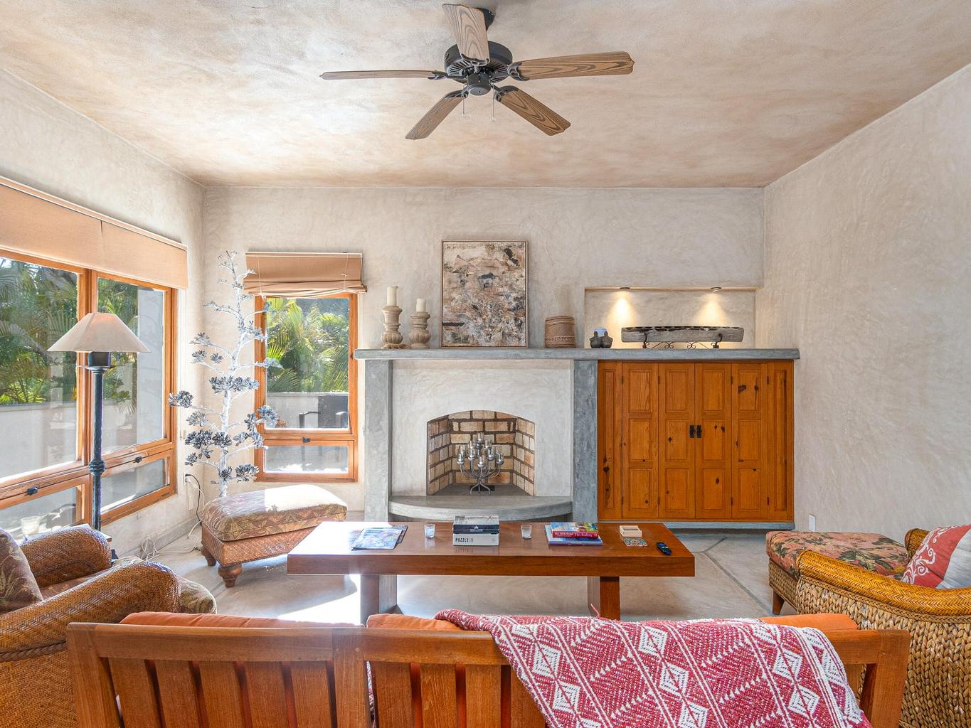The interior features a chef's kitchen equipped with premium appliances, polished concrete countertops, and custom wood cabinetry. The home is furnished in a tasteful, classic style, offering turnkey elegance. The master suite serves as a private sanctuary with travertine marble, dual sinks, and a walk-in shower. All guest bedrooms include king-size beds and en-suite bathrooms, and are strategically located to ensure