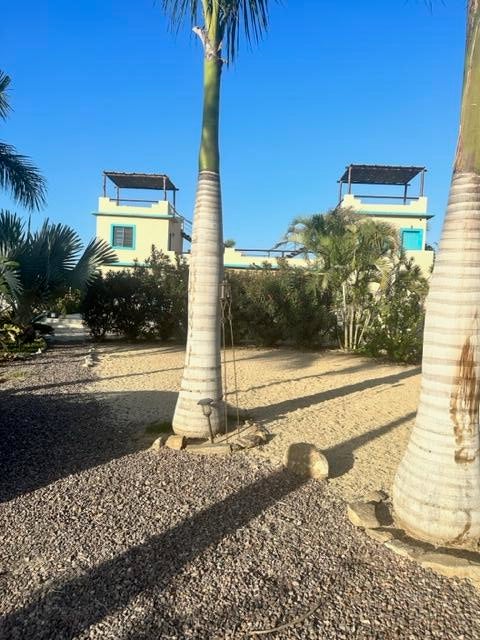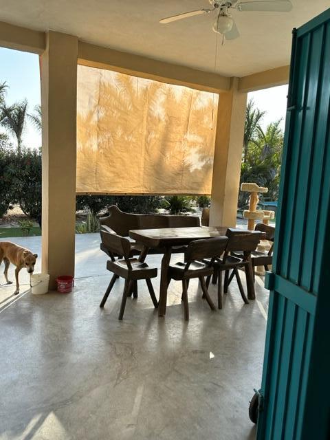 At the heart of the home is a spacious **community kitchen, dining, and living area**, perfect for shared meals, gatherings, and creating lasting memories. Surrounded by **mature palm and fruit trees**, the property is lush with tropical vegetation, creating an oasis-like atmosphere.