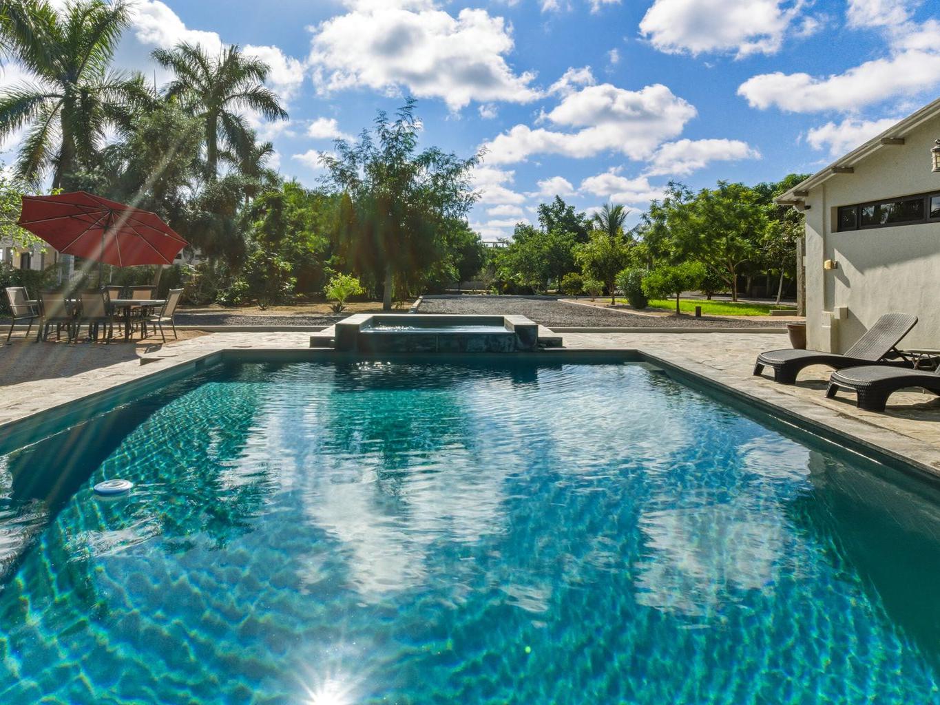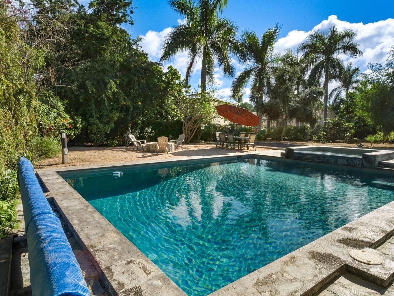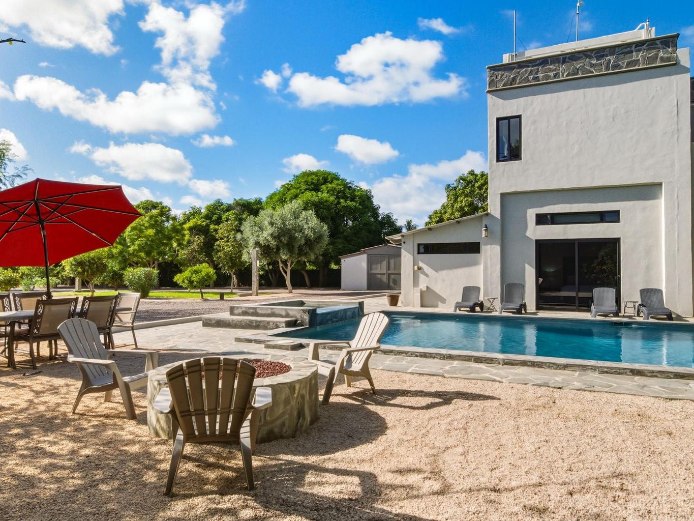 Built for hosting, the property features a heated saltwater pool and hot tub, large garden with fruit trees, lawn games, and multiple outdoor lounges for dining and entertaining. Inside, guests enjoy AC and heating, high-speed internet, a chef's kitchen, shuffleboard, two BBQs, and both indoor and outdoor living rooms.