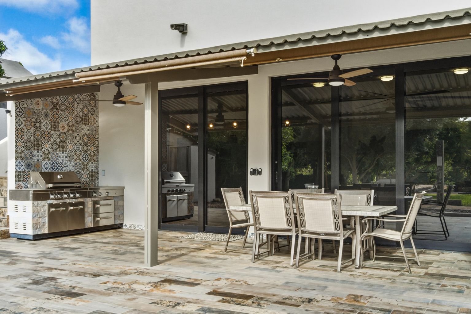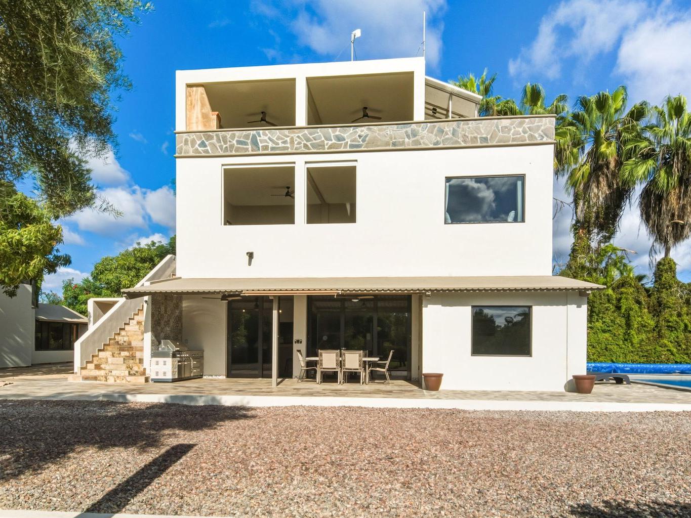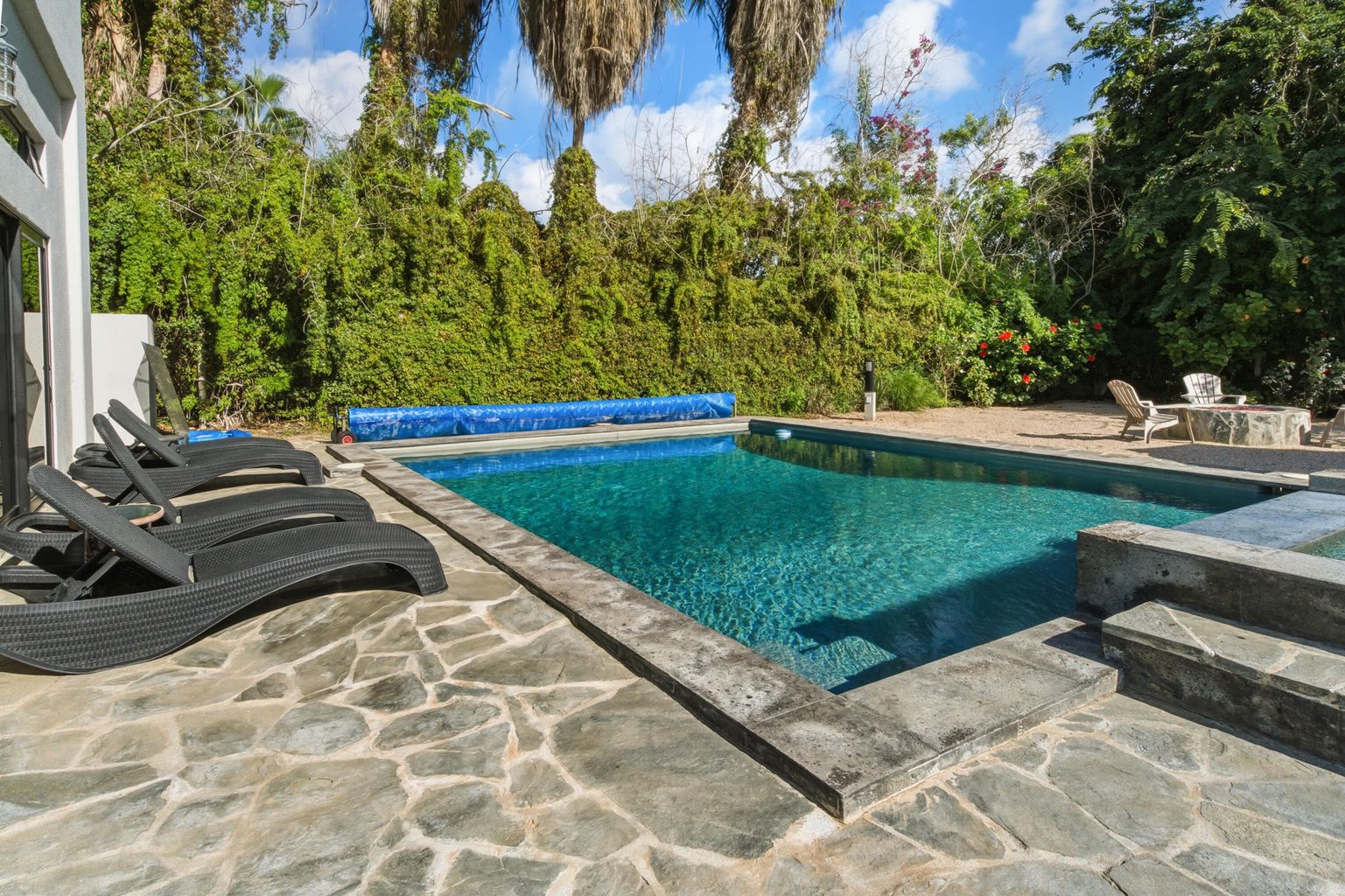 Built for hosting, the property features a heated saltwater pool and hot tub, large garden with fruit trees, lawn games, and multiple outdoor lounges for dining and entertaining. Inside, guests enjoy AC and heating, high-speed internet, a chef's kitchen, shuffleboard, two BBQs, and both indoor and outdoor living rooms.