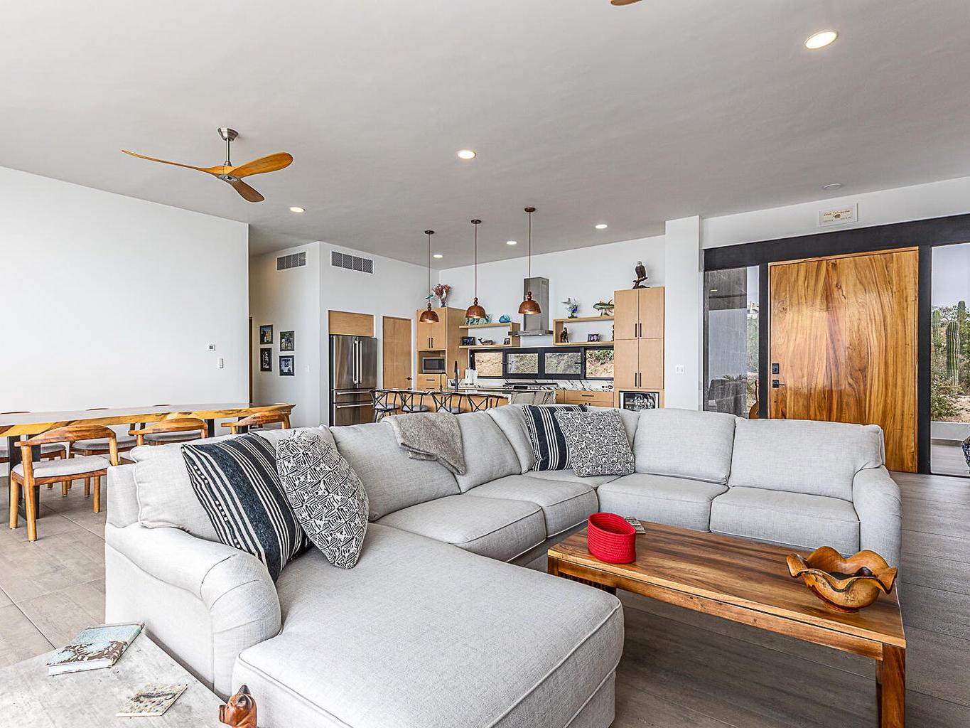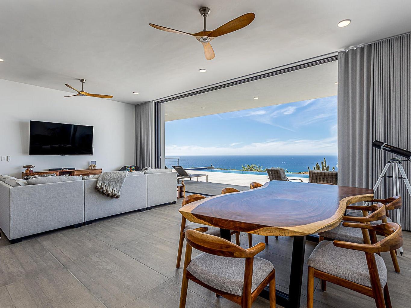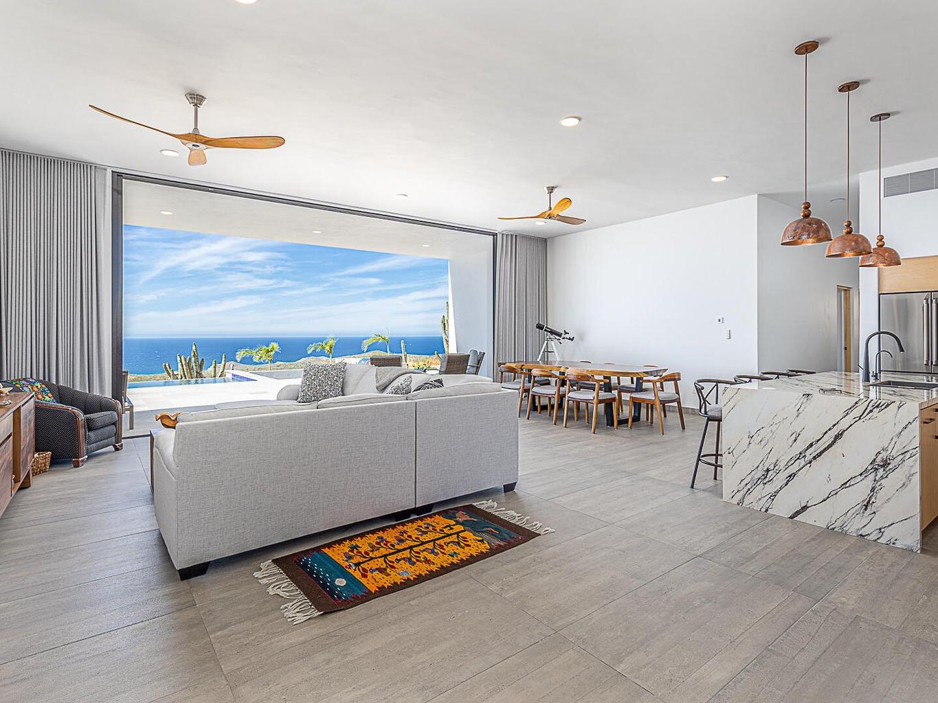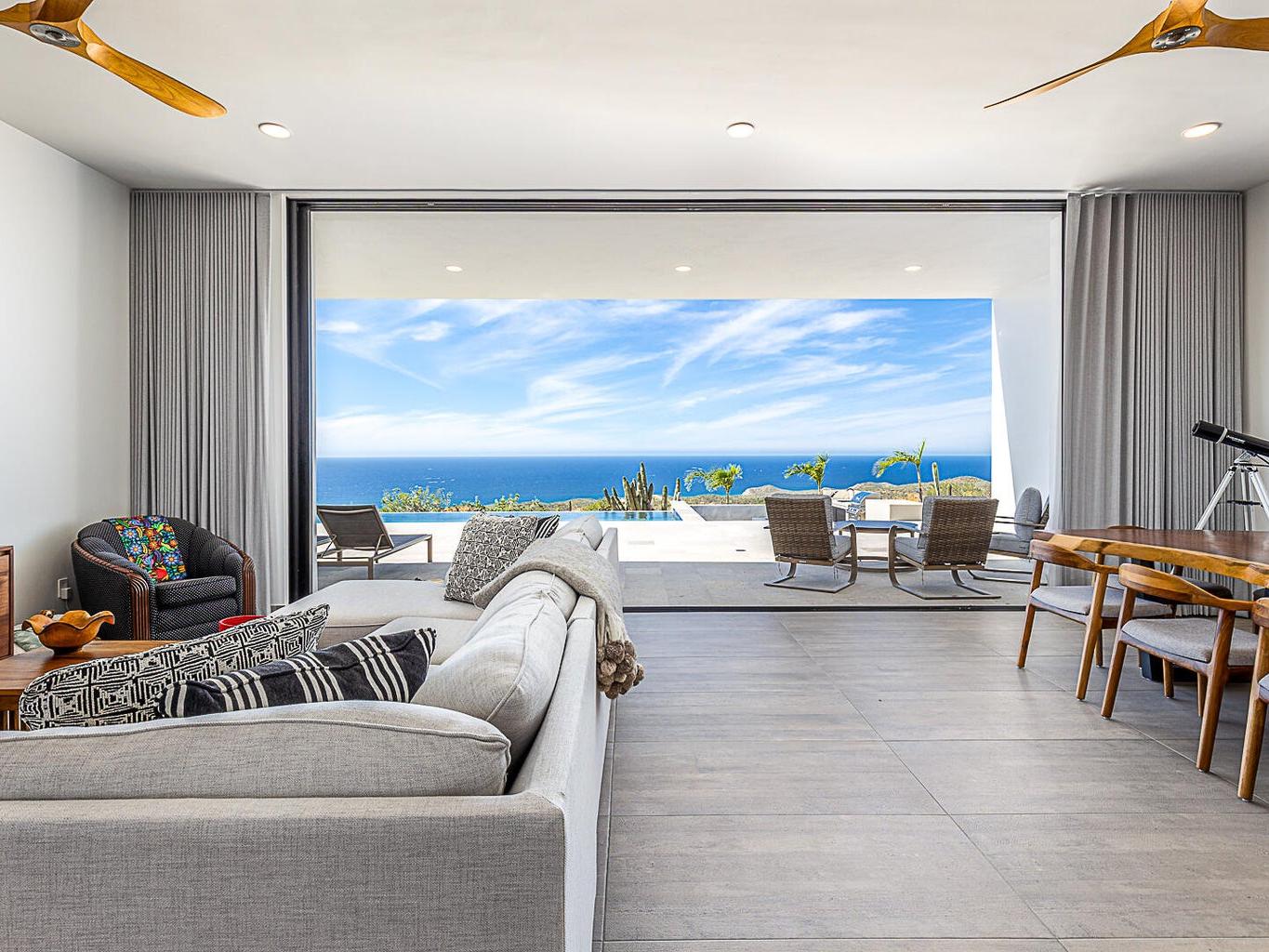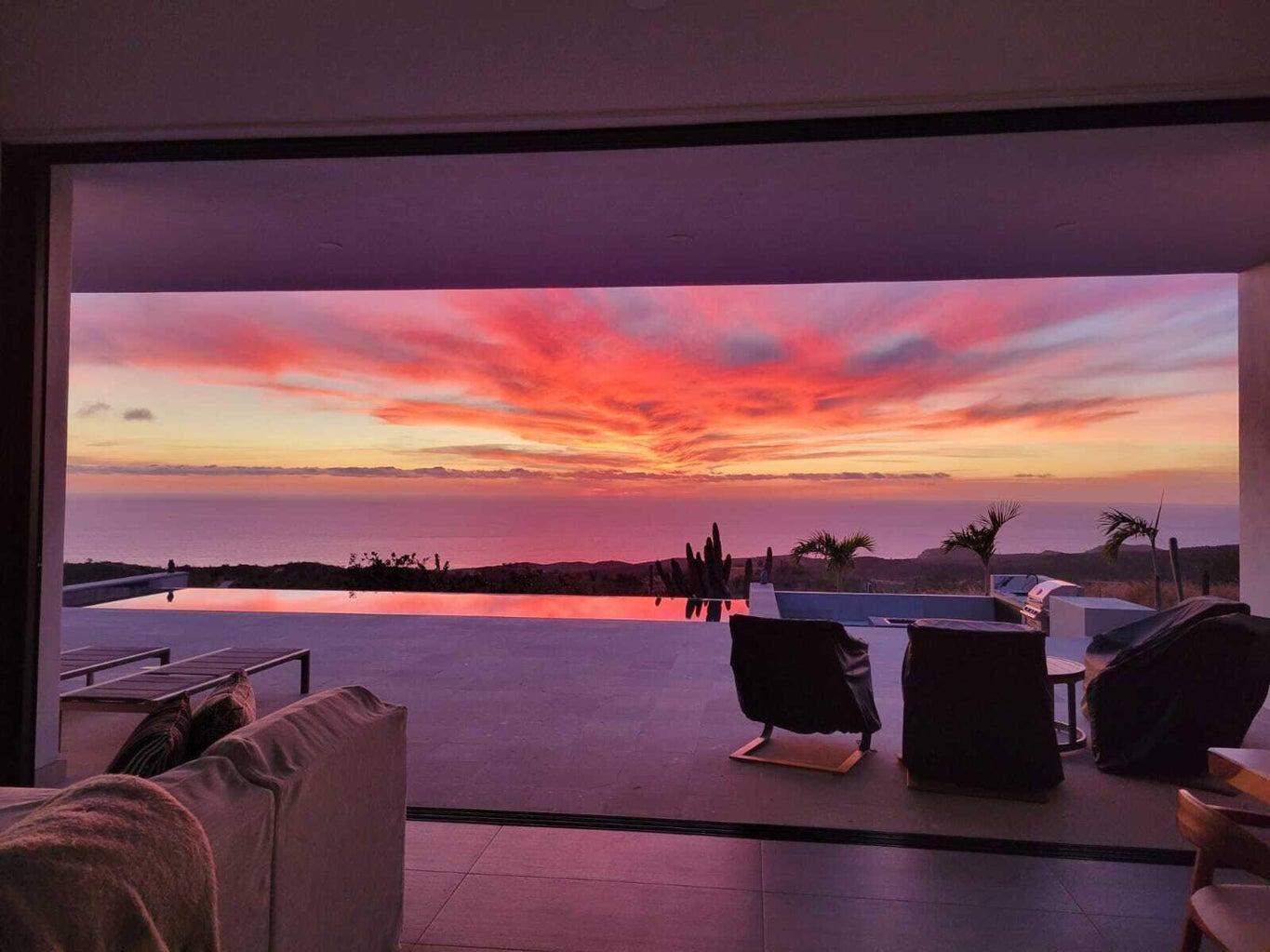 Featuring Forever Panoramic Views of the Pacific & Beaches, & spectacular vistas of migrating Whales, colorful Sunsets, & Desert meets the Sea Flora & Fauna. Casa Tranquila is a brand new contemporary 3 bedroom home, with spacious living areas, high ceilings, & beautifully decorated, furnished & designed with spectacular Ocean Views from every room. Casa Tranquila is situated on one of the best ocean view Lots in Rolling Hills, close to the beach, & features an Infinity Pool & huge Patio Sun Deck, shaded sitting Terraces, a Poolside Fire Pit with Outside Kitchen & BBQ. Additional features include a spacious ocean view Roof Deck above an oversized 2 car Garage, 20 KW Cummins automatic back-up Genset with a 1000 liter Propane Tank, & XL size 20,000 liter Cistern for plenty of H20 capacity.