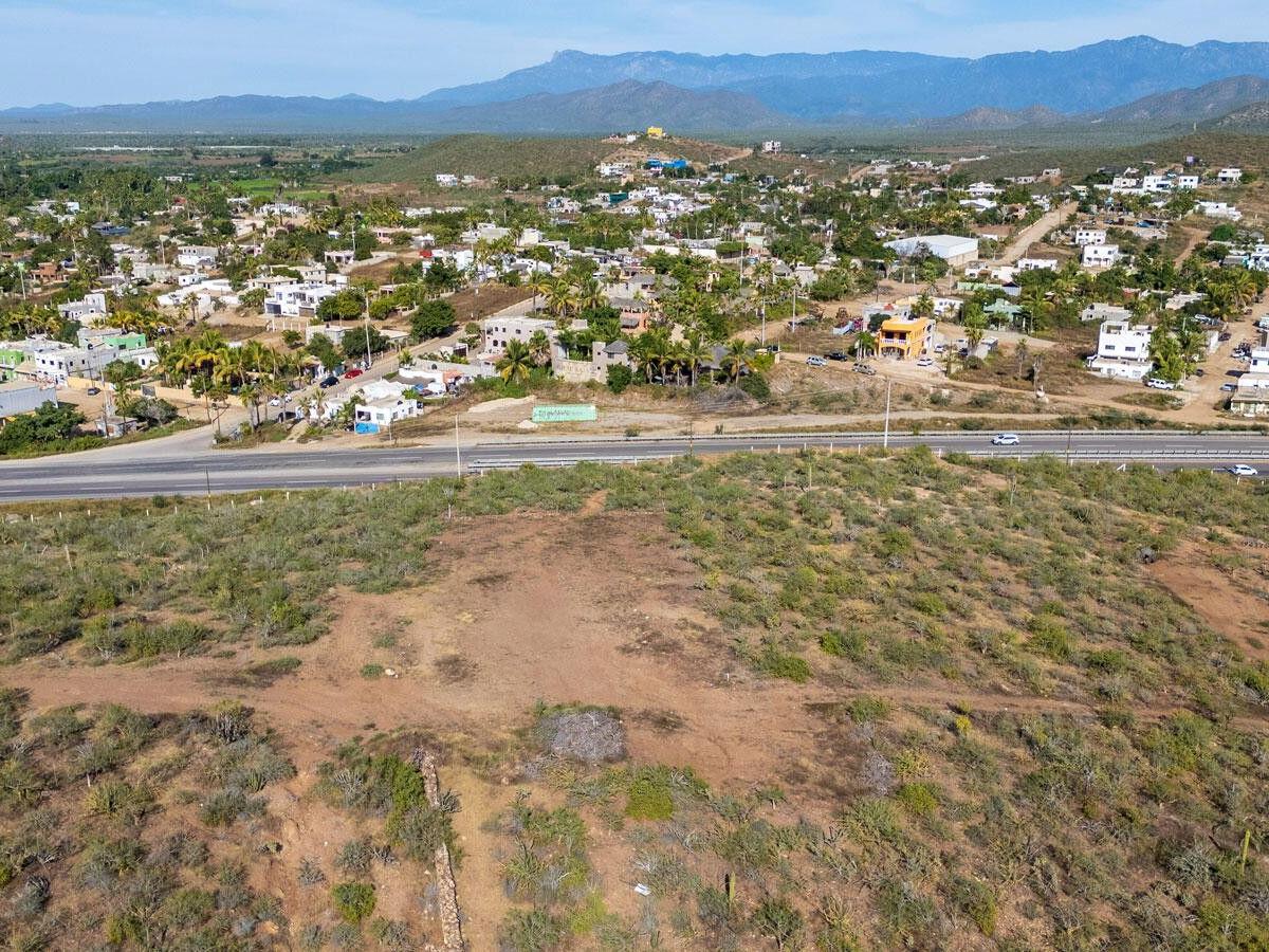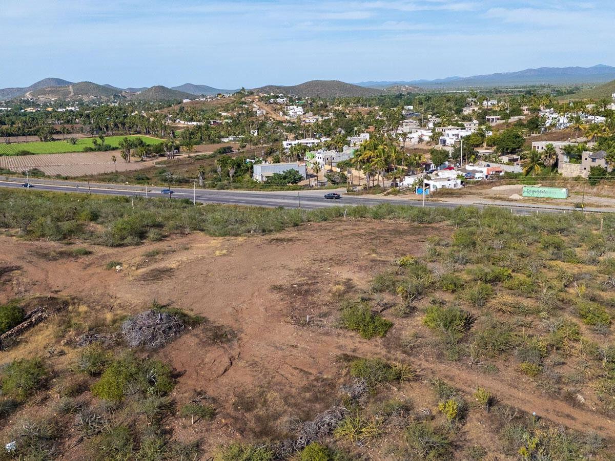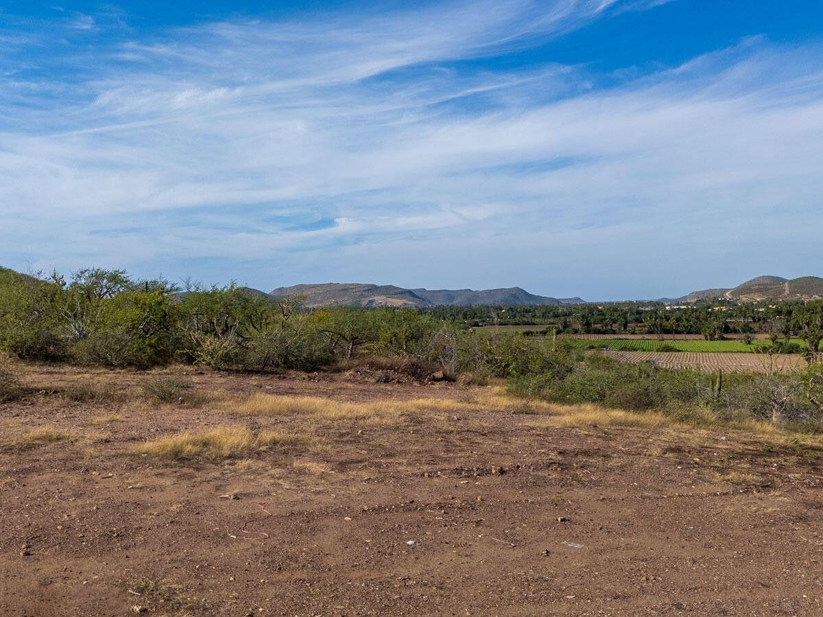 Lote Vista Grande is an elevated 1,260 m² level lot located above the farmlands of El Pescadero. Enjoy both sunrise and sunset from this prime vantage point, with unobstructed views of the Pacific Ocean, Los Cerritos, and the Sierra de la Laguna mountain range. This unique property is build-ready with the lot cleared, an access road in place, and building plans available. Direct access from Highway 19 provides potential for residential or commercial use, including an ideal location for a restaurant or boutique accommodations. Located just 5 minutes to swimmable Cerritos Beach, 2 minutes to El Pescadero, and 10 minutes to Todos Santos!