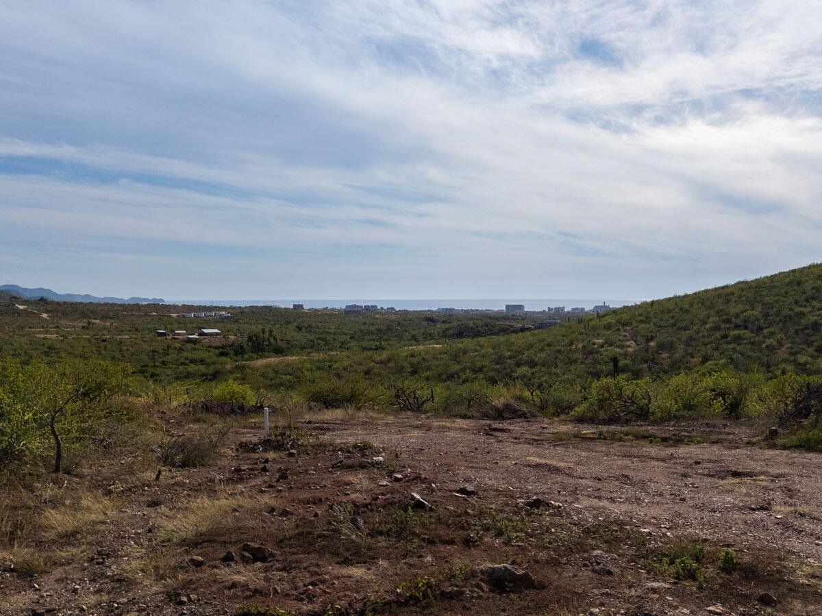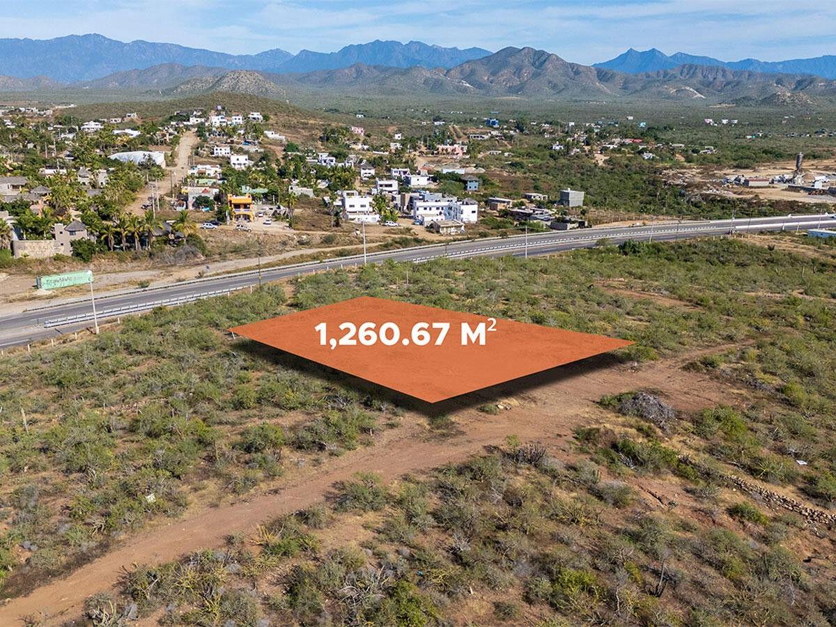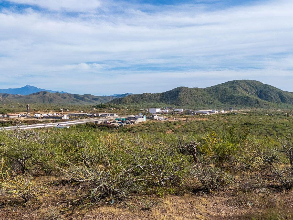 Lote Vista Grande is an elevated 1,260 m² level lot located above the farmlands of El Pescadero. Enjoy both sunrise and sunset from this prime vantage point, with unobstructed views of the Pacific Ocean, Los Cerritos, and the Sierra de la Laguna mountain range. This unique property is build-ready with the lot cleared, an access road in place, and building plans available. Direct access from Highway 19 provides potential for residential or commercial use, including an ideal location for a restaurant or boutique accommodations. Located just 5 minutes to swimmable Cerritos Beach, 2 minutes to El Pescadero, and 10 minutes to Todos Santos!
