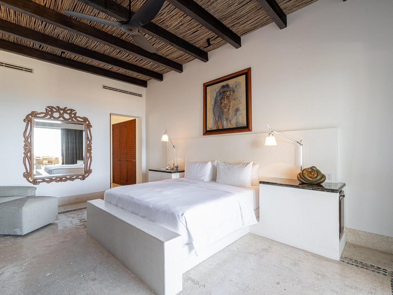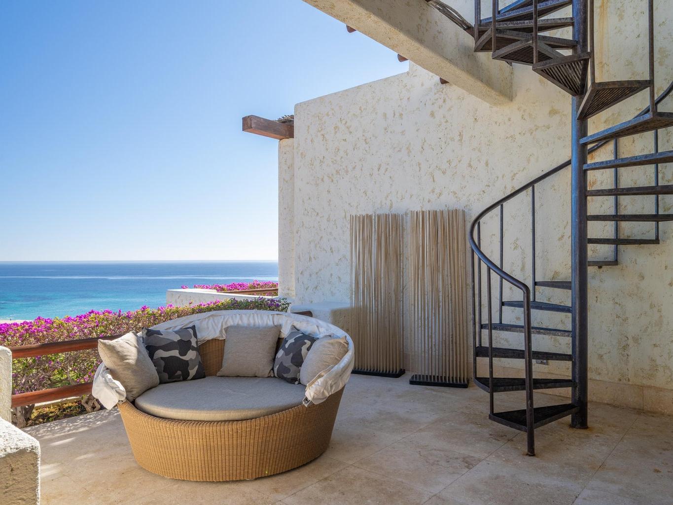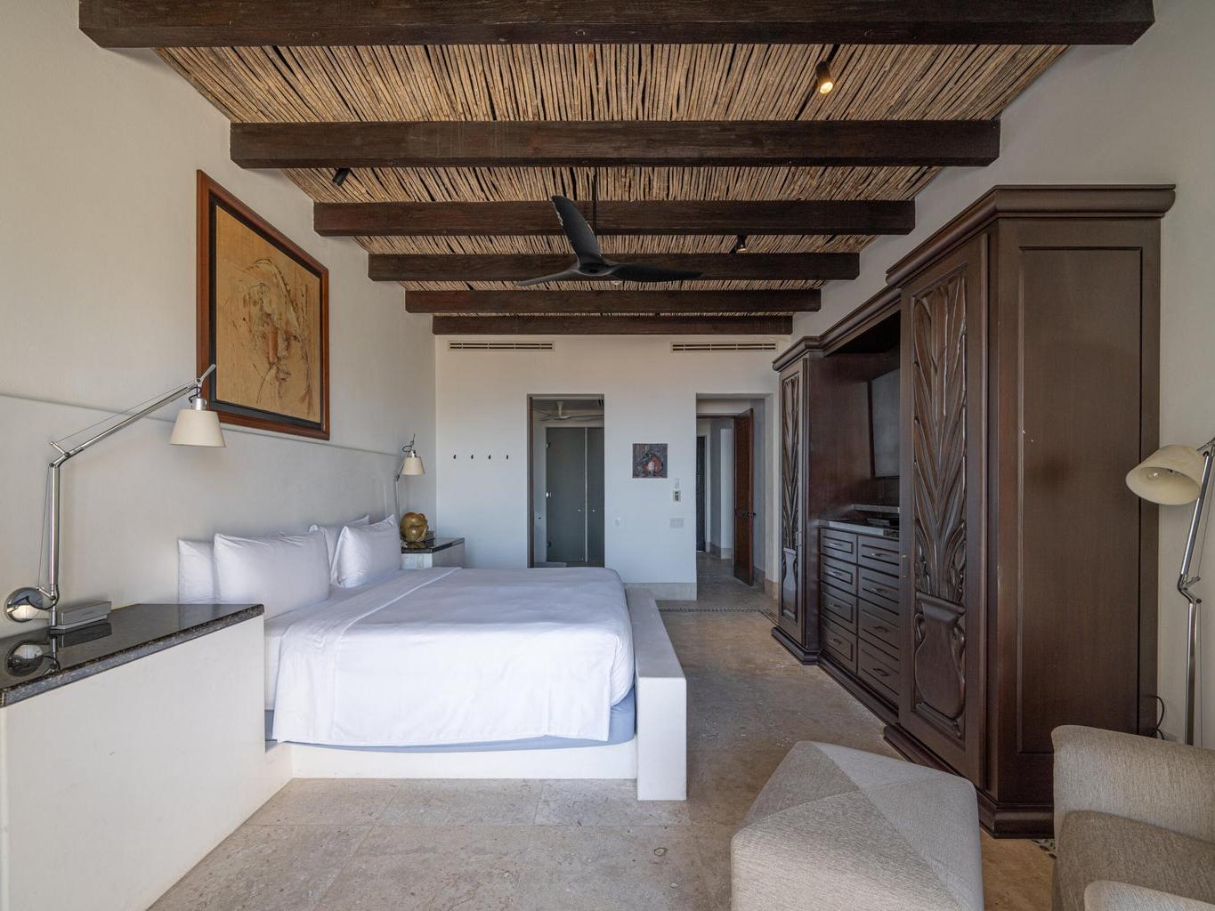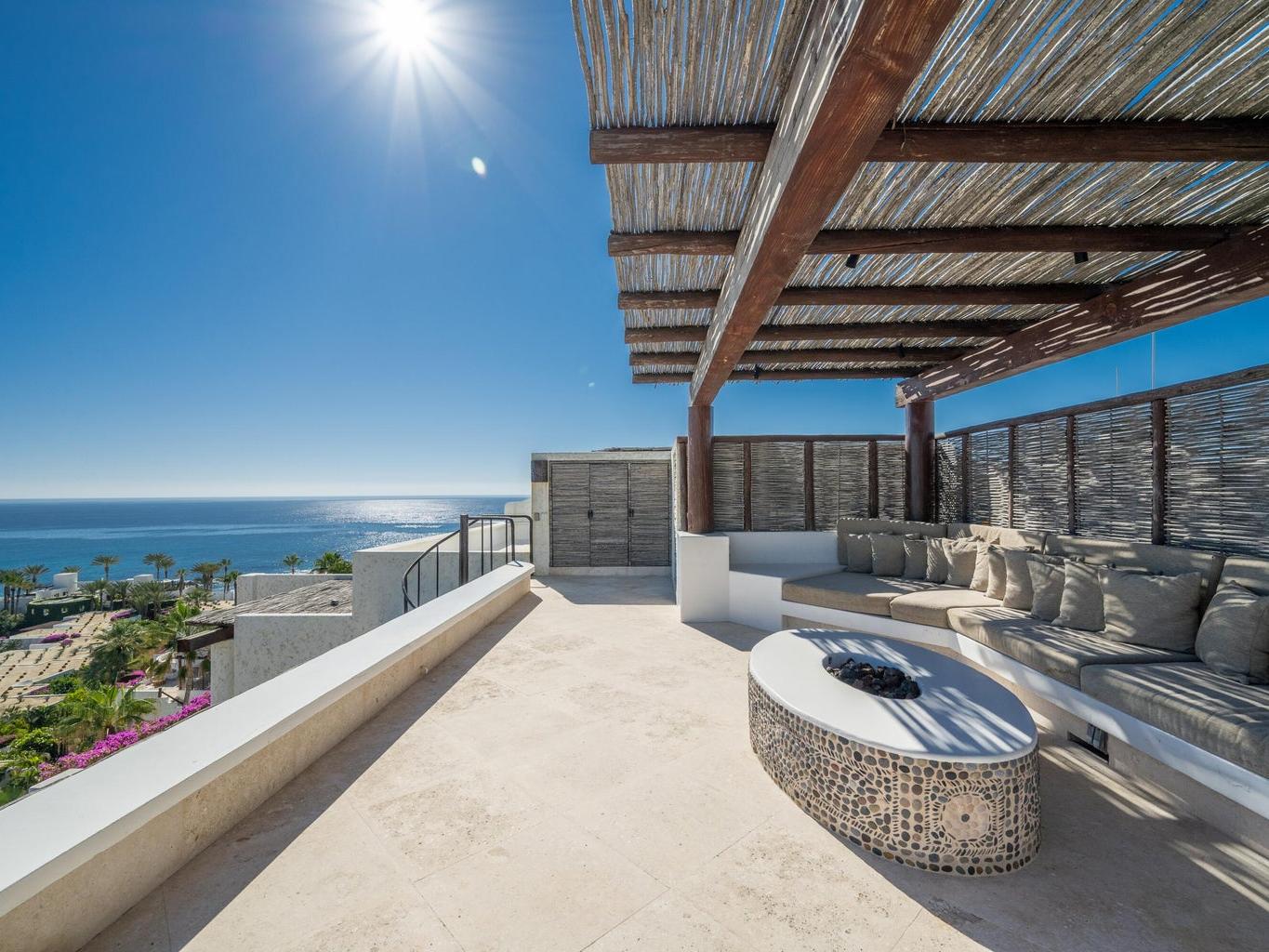 Designed for effortless indoor-outdoor living, the residence features three private terraces and a spacious rooftop deck, creating multiple settings for relaxation, entertaining, and quiet moments under the Baja sky. Inside, elegant marble flooring, soaring beamed ceilings, and a generous open living area flow seamlessly.