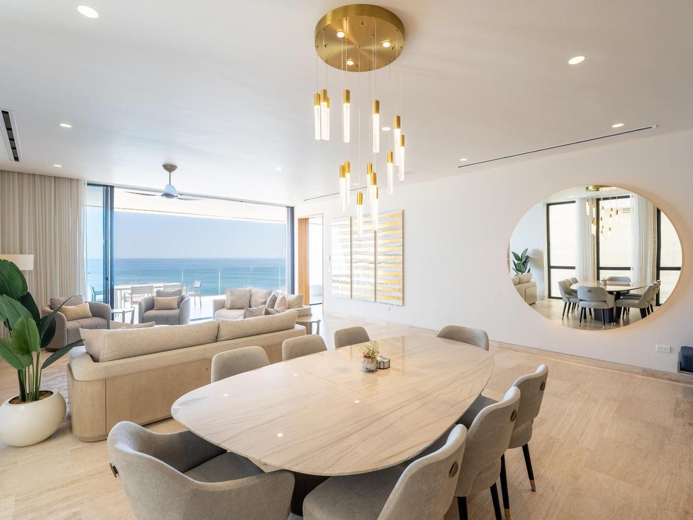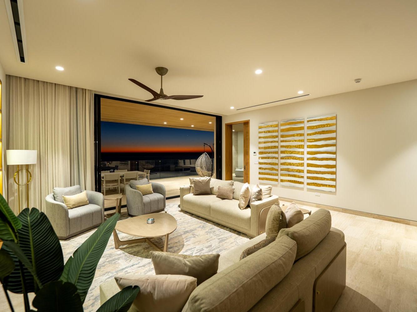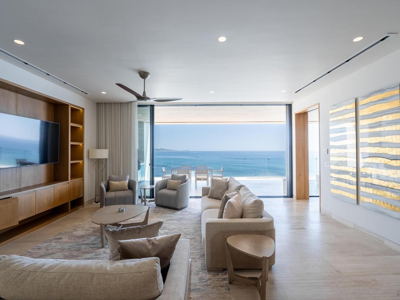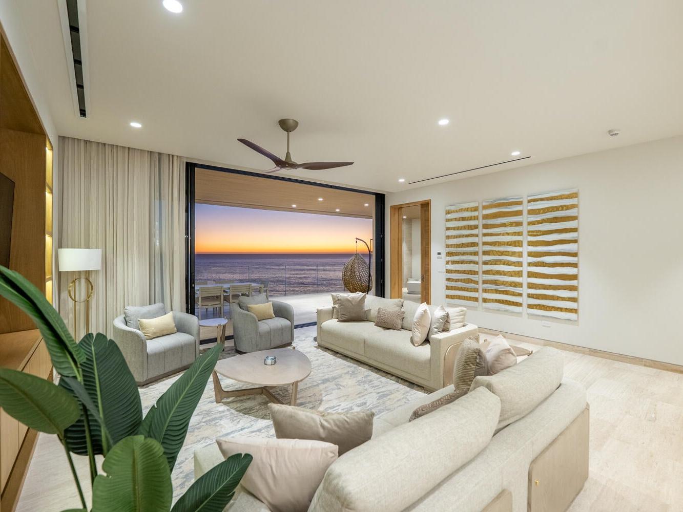 Soar above it ALL in this forever Oceanview Residences in Querencia, offering panoramic Sea of Cortez views, exceptional sunrises, and a refined coastal lifestyle. Positioned on the third floor, one of the highest vantage points in the community, this residence delivers light-filled serenity, privacy with seamless indoor and outdoor living. This three-bedroom plus one bunkroom layout features floor-to-ceiling glass, a spacious terrace overlooking the vibrant Q Beach Club, built-in BBQ, upgraded lighting, two double-space parking spots, and a private owner's lock-off. Footsteps from 3 dining options, Spa, Fitness facility and the warm golden sand, all is provided for. The home is offered fully furnished with a premium, high-quality decor package along with proven rental ROI potential.