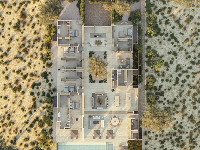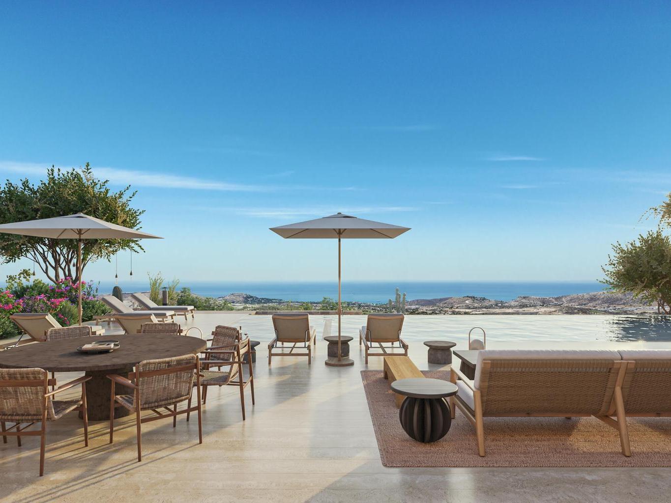 The residence features five en-suite bedrooms with private terraces. The gourmet kitchen connects to indoor and outdoor living spaces, including a veranda with a pool, spa, firepit, and dining areas overlooking golf, mountains, and ocean vistas. Additional highlights include a family room, two-car garage, smart home technology, and solar readiness. Perfectly located within Palmilla, it offers direct access to The Commons, Arroyo Park, El Once golf course, plus eligibility for memberships in Club Ninety-Six.