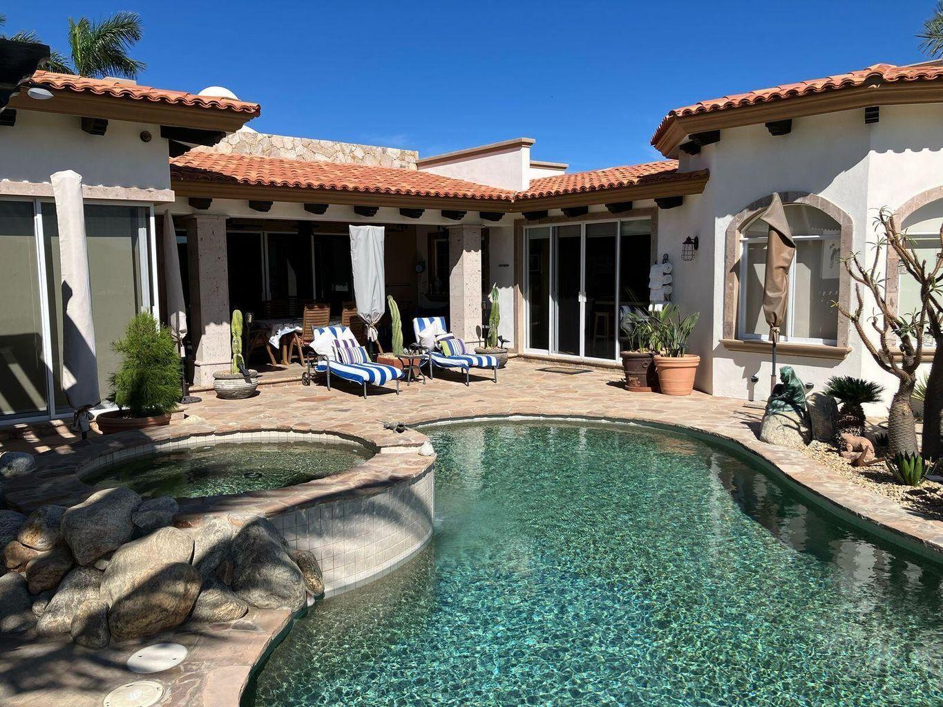 Discover a standout investment opportunity in coveted Palmilla Estates, where relaxed coastal style meets refined comfort. This single-story 3-bedroom, 3-bath home blends natural stone, warm wood beams, and a gourmet kitchen with high-end appliances, breakfast nook, and full bar. A generous entry courtyard opens to a heated pool, jacuzzi, outdoor kitchen, and a sun-washed yard overlooking the 9th fairway of the Jack Nicklaus Mountain Course. Eligible for a golf membership, it also makes an effortless vacation retreat with close access to Palmilla Beach, world-class amenities, and the charming San José town center.
