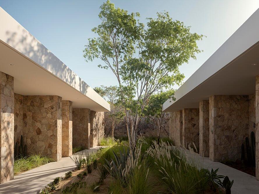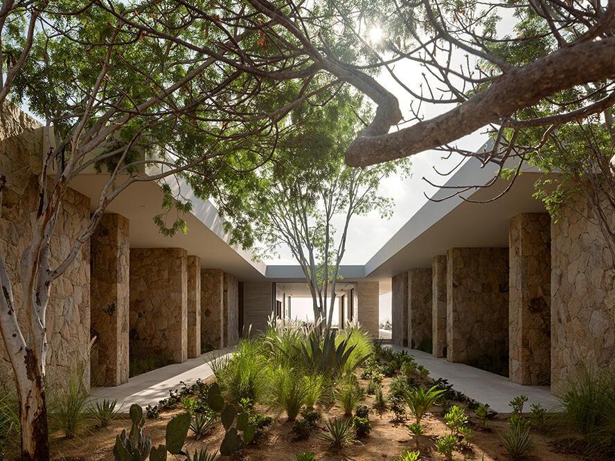 The floor plan offers a thoughtful separation between social and private spaces. The primary living areas are distinct from the bedroom wings, which are arranged around a landscaped courtyard.