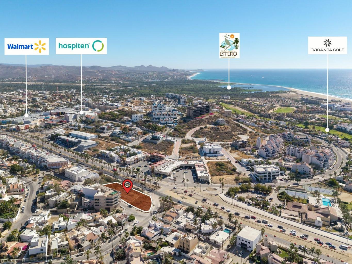 Discover a prime 1,7547m² (18,804 sqft) lot in San José del Cabo's lively commercial and residential hub. Featuring 45 meters of highway frontage, this property is right across from Vidanta Golf Club and at the Colonia Magisterial entrance. With mixed-use zoning approved for six stories plus a rooftop terrace, it's perfect for a development project. Ocean views are available from the third floor. Pre-approved mixed-use development of 35 condos, including 7 penthouses with private rooftop and 14 commercial spaces on the ground floor.