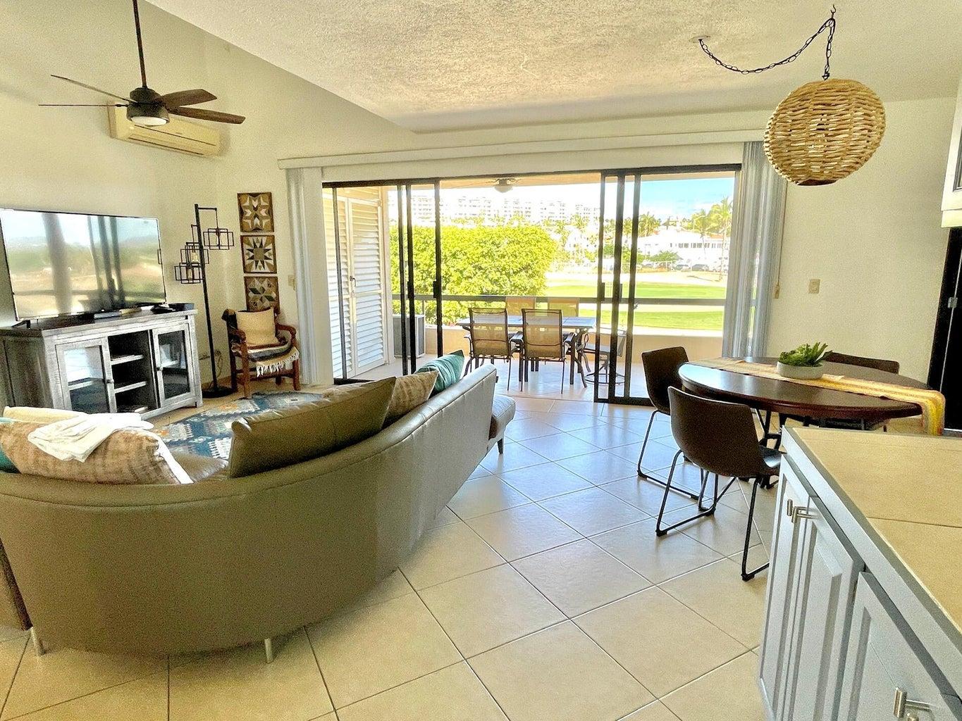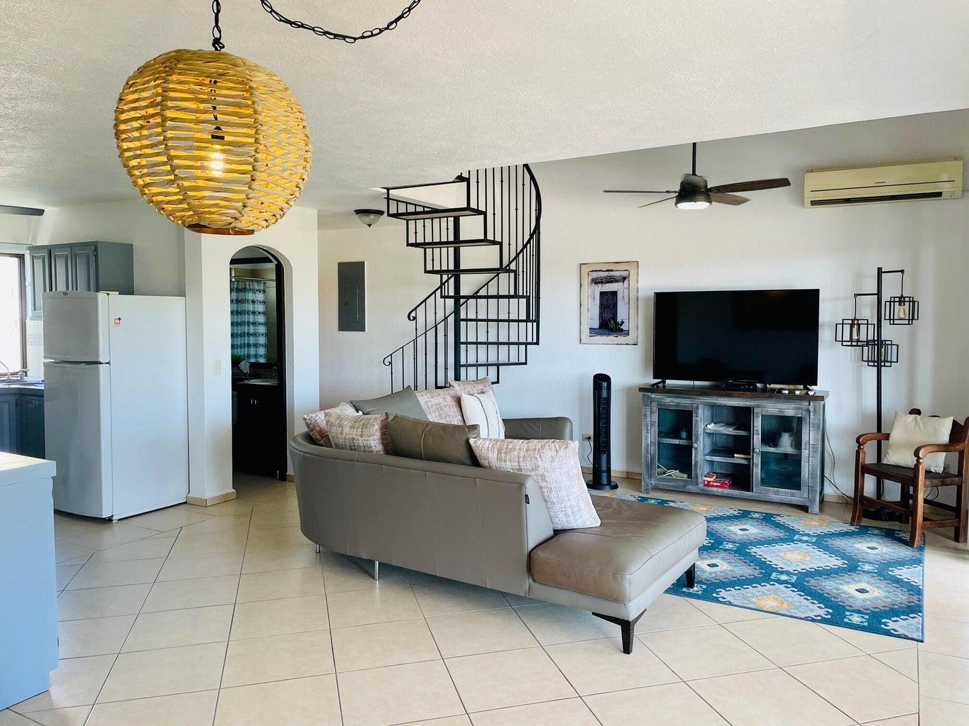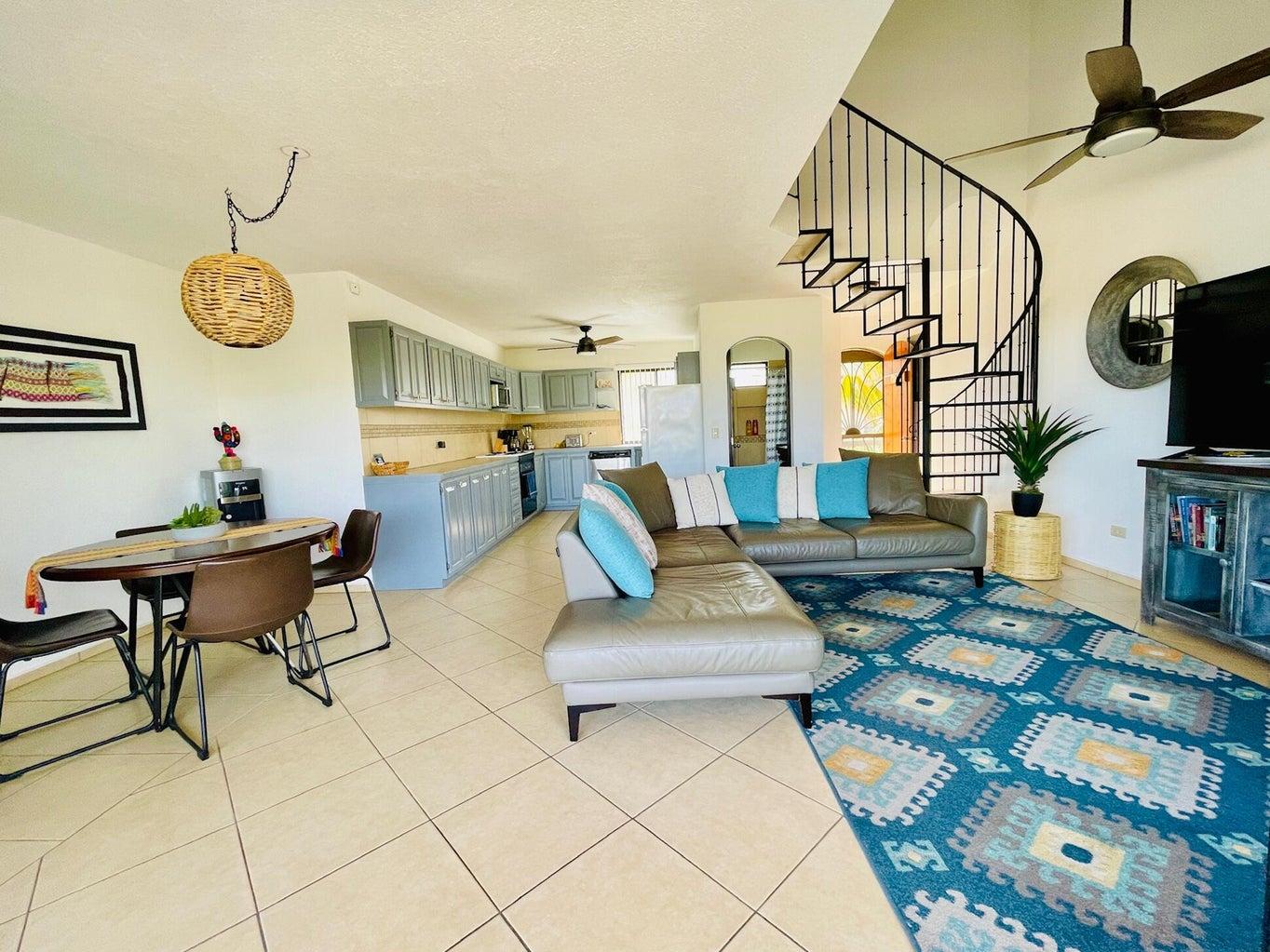 Beautifully renovated two-story penthouse in the highly coveted Club La Costa community. Ideally located just steps from restaurants, shopping, Plaza Pescador, and the Art District, and only a 3-minute walk to the beach. This pristine condo offers beautiful golf course and mountain views and has been recently upgraded with fresh interior paint, new kitchen cabinets, new lighting fixtures, all new mattresses, and a new air conditioner in the main living area. Gated community with three swimming pools, jacuzzis, and private access to Plaza Pescador. Turnkey and move-in ready.