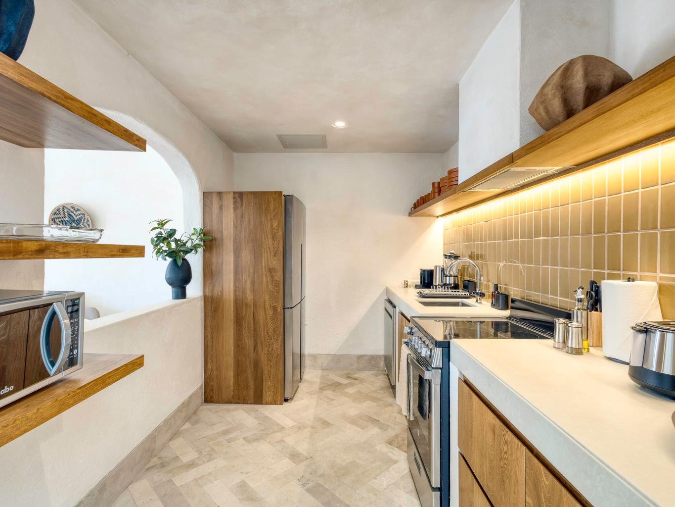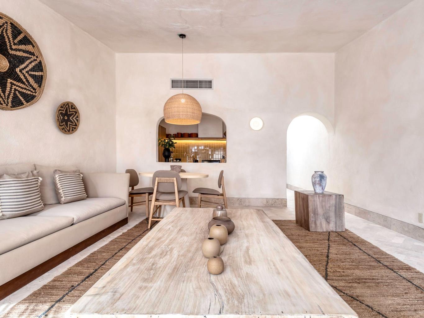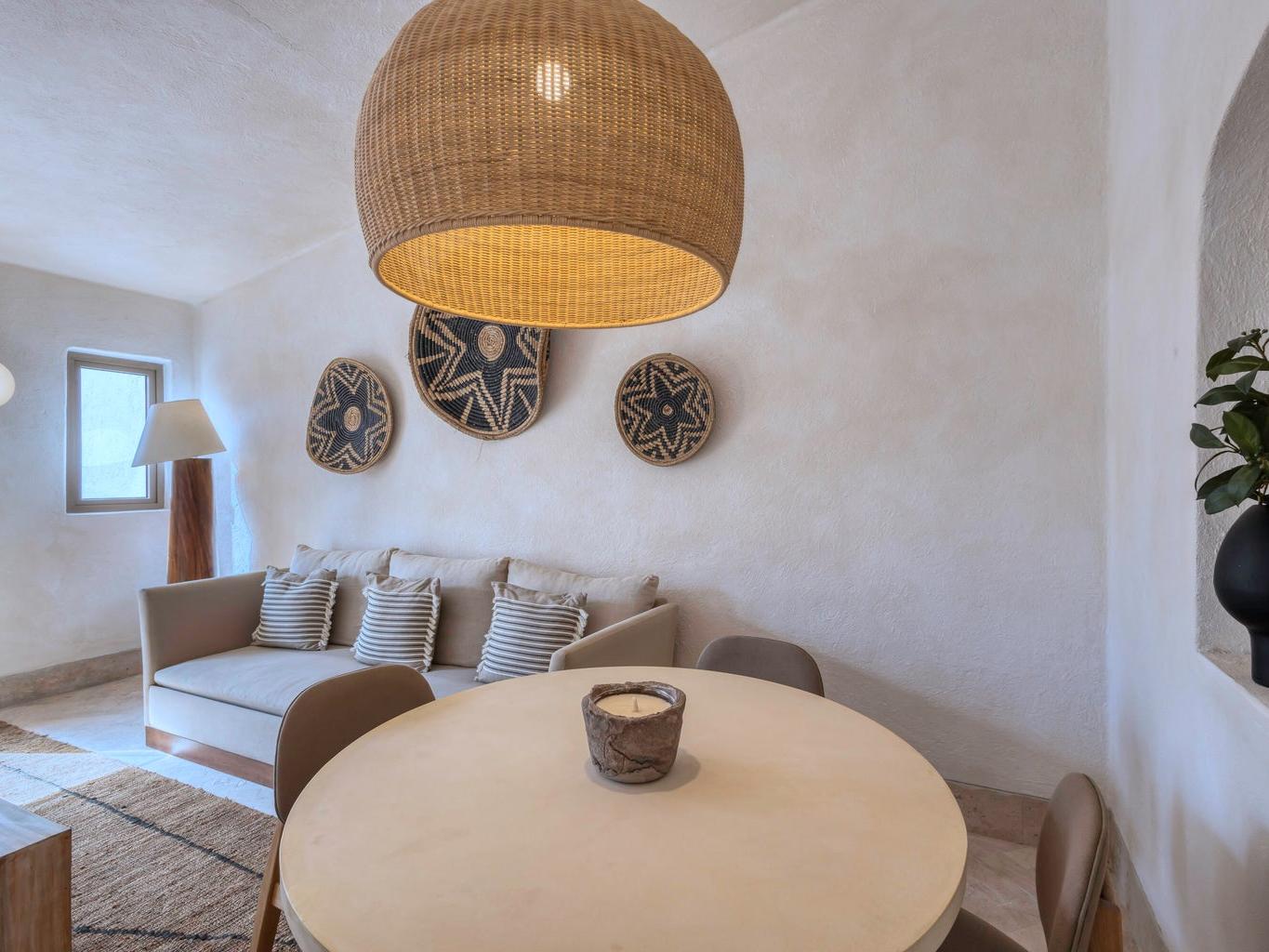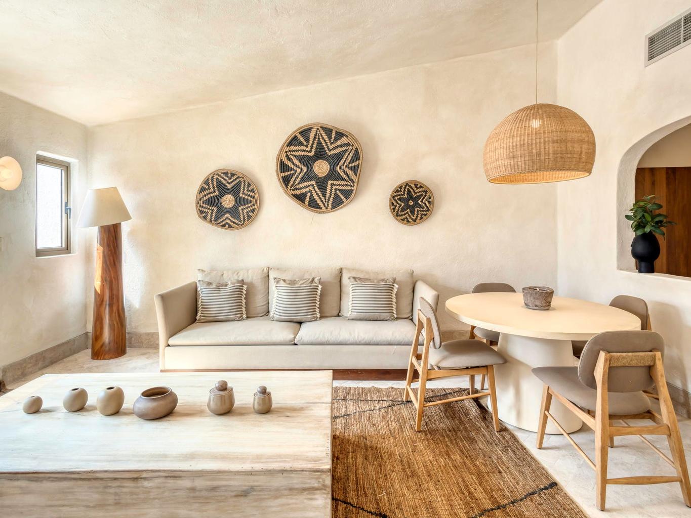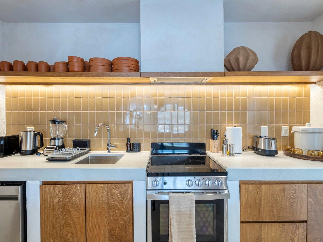 This charming casita at Casa Nima features a spacious living and dining area, a bright kitchen with quartz countertops, and a full Jack-and-Jill bathroom.