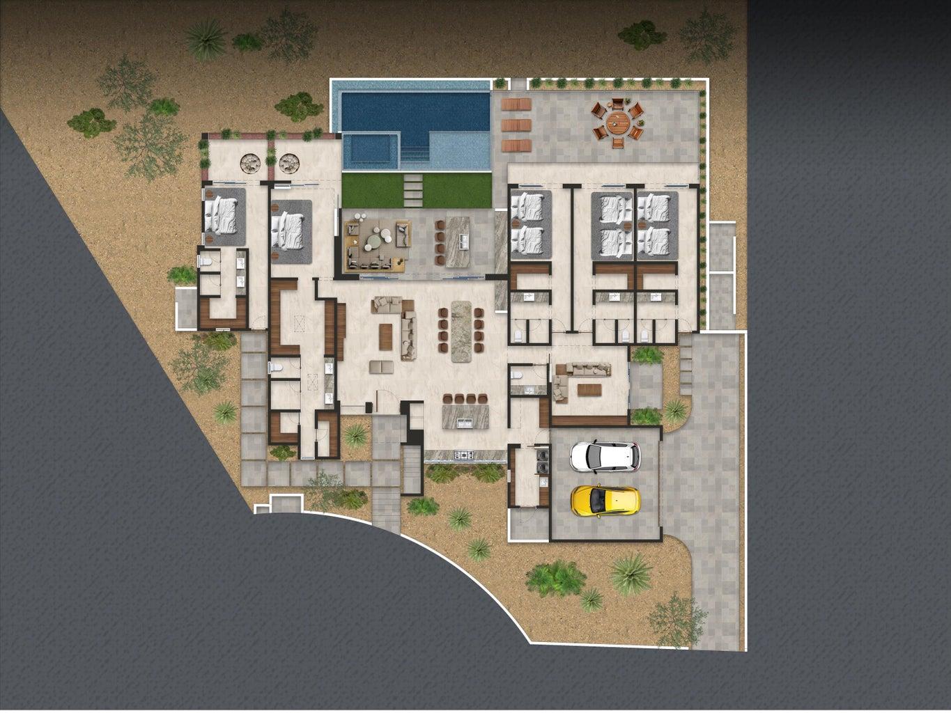 This single‑level contemporary residence offers 5 bedrooms, 5.5 baths, TV room, 2‑car garage, and covered terrace with BBQ. Designed with Wolf/Sub‑Zero appliances, pool, spa, and roof deck with fire pit, Casa Nirvana blends modern comfort with resort‑style living.