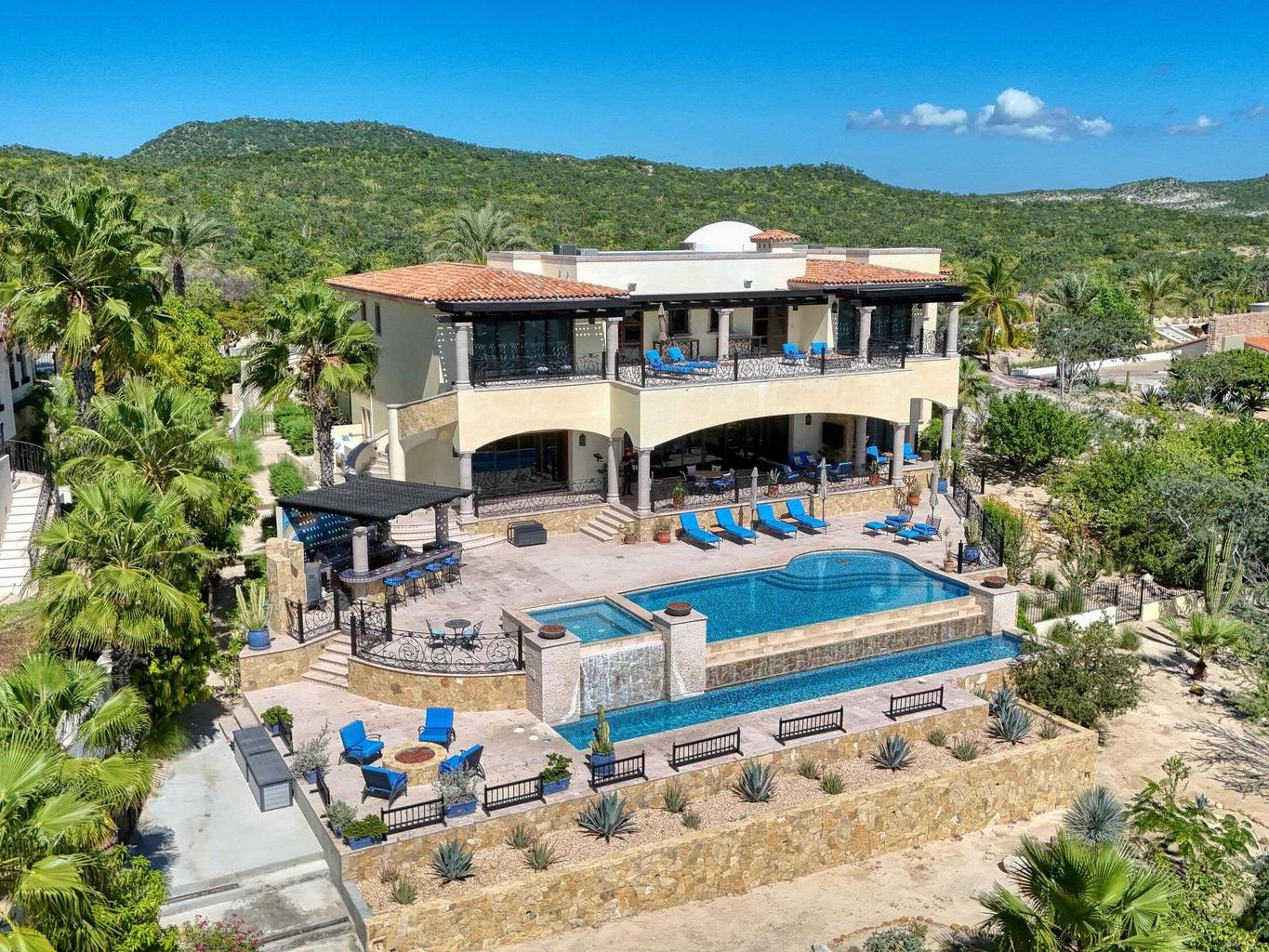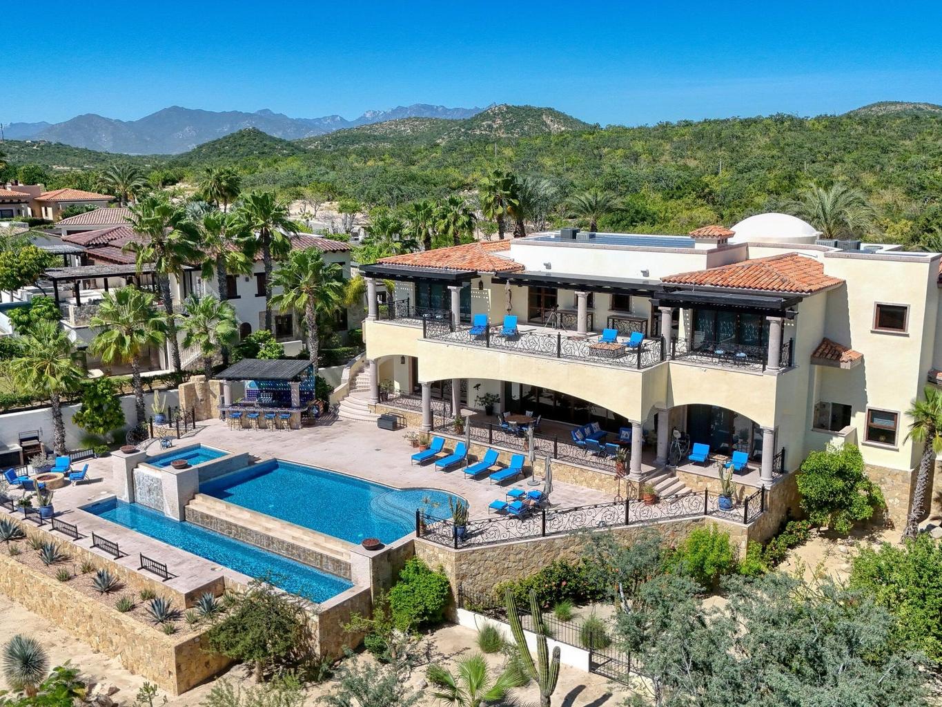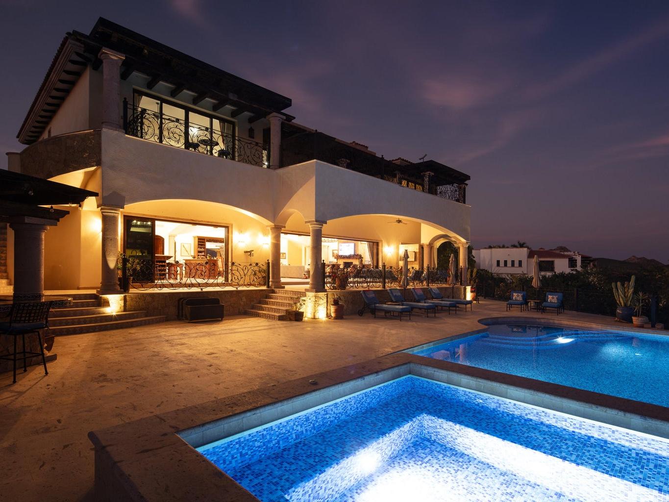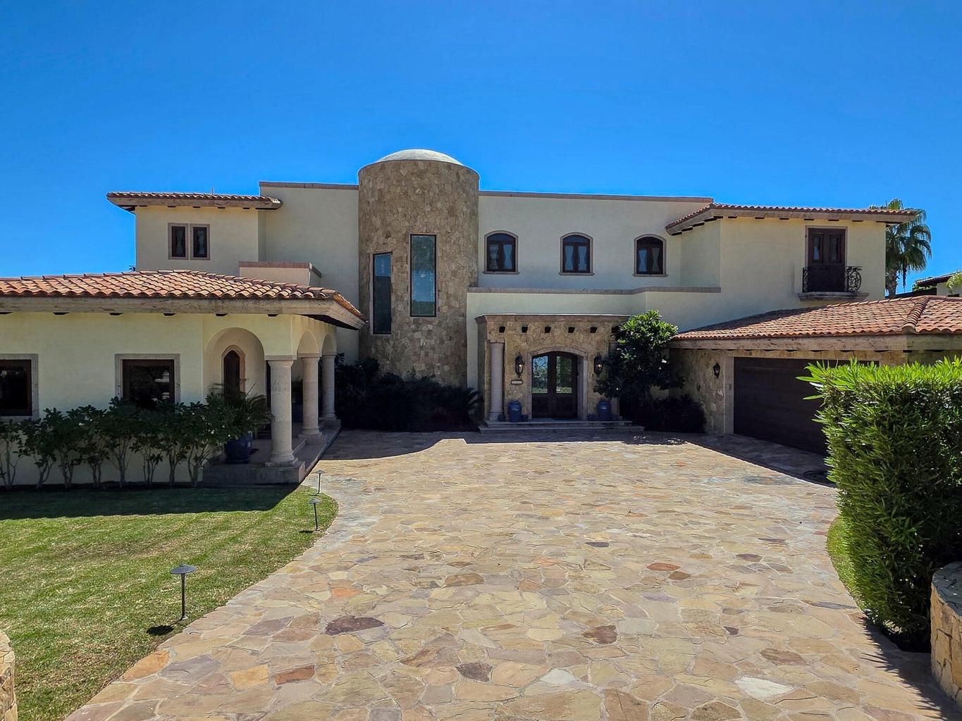 Casa Miramar, Puerto Los Cabos — A timeless Hacienda-style estate perched above the Sea of Cortez in one of Cabo's most prestigious gated communities. This residence features 4 spacious bedrooms, 5 bathrooms, a dedicated office, and a separate TV/media room. Enjoy clear ocean views from both the first and second levels, elegant architectural details, and seamless indoor-outdoor living designed for entertaining and relaxation.