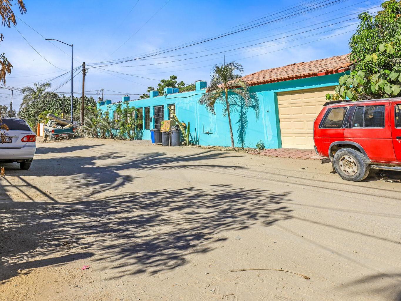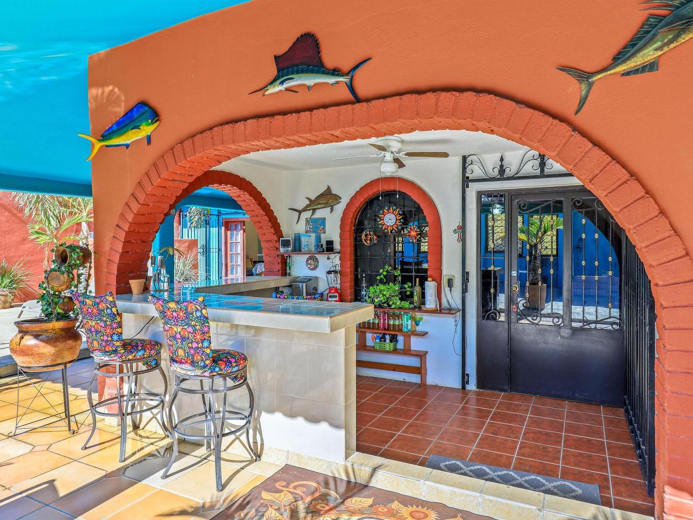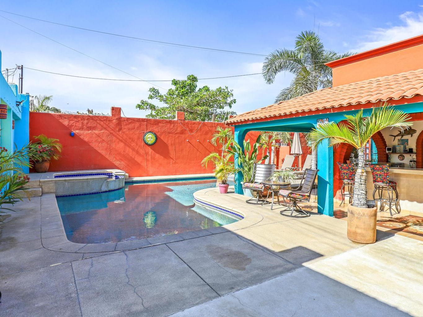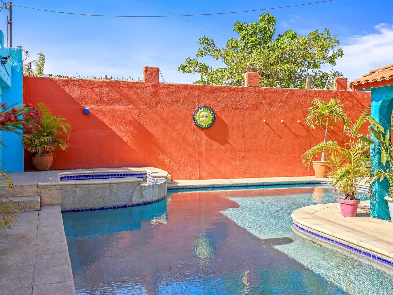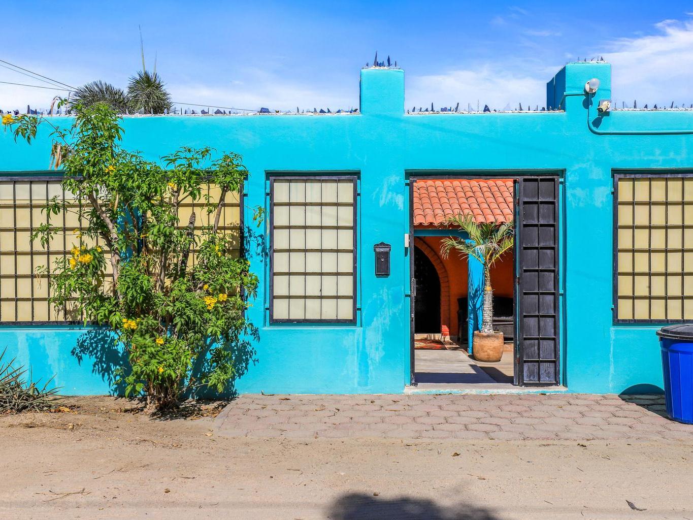 Tucked along a quiet dirt road in northern San José del Cabo, this colorful 4-bedroom, single-level home is ideal for rentals. Features include a detached room for office or guests, indoor and outdoor kitchens, pool, hot tub, outdoor shower, garage, and rooftop sitting area for relaxing and entertaining.
