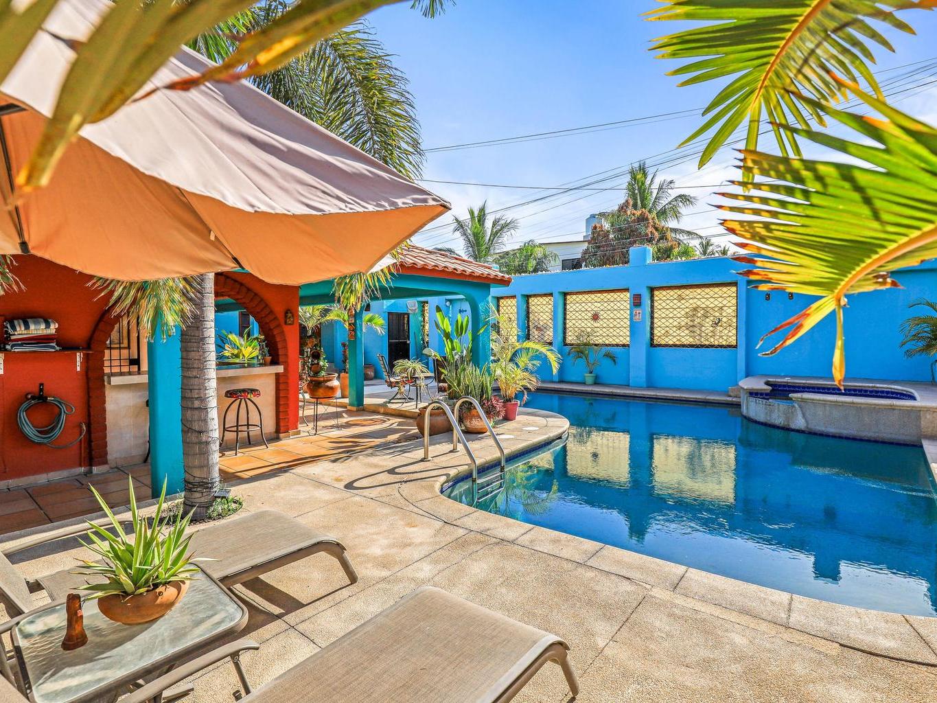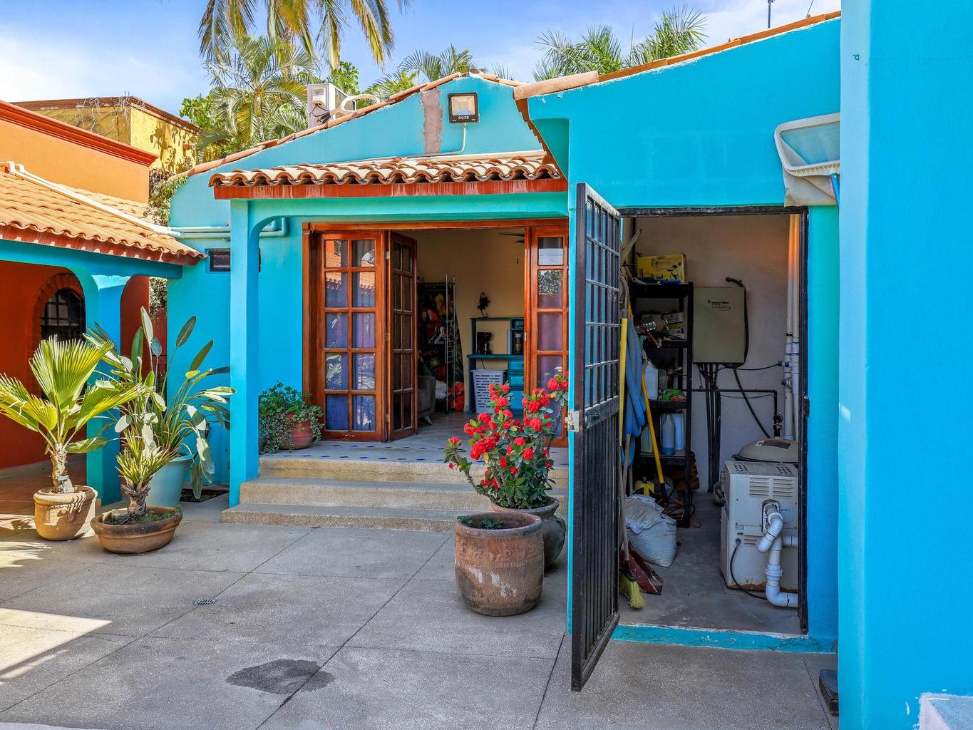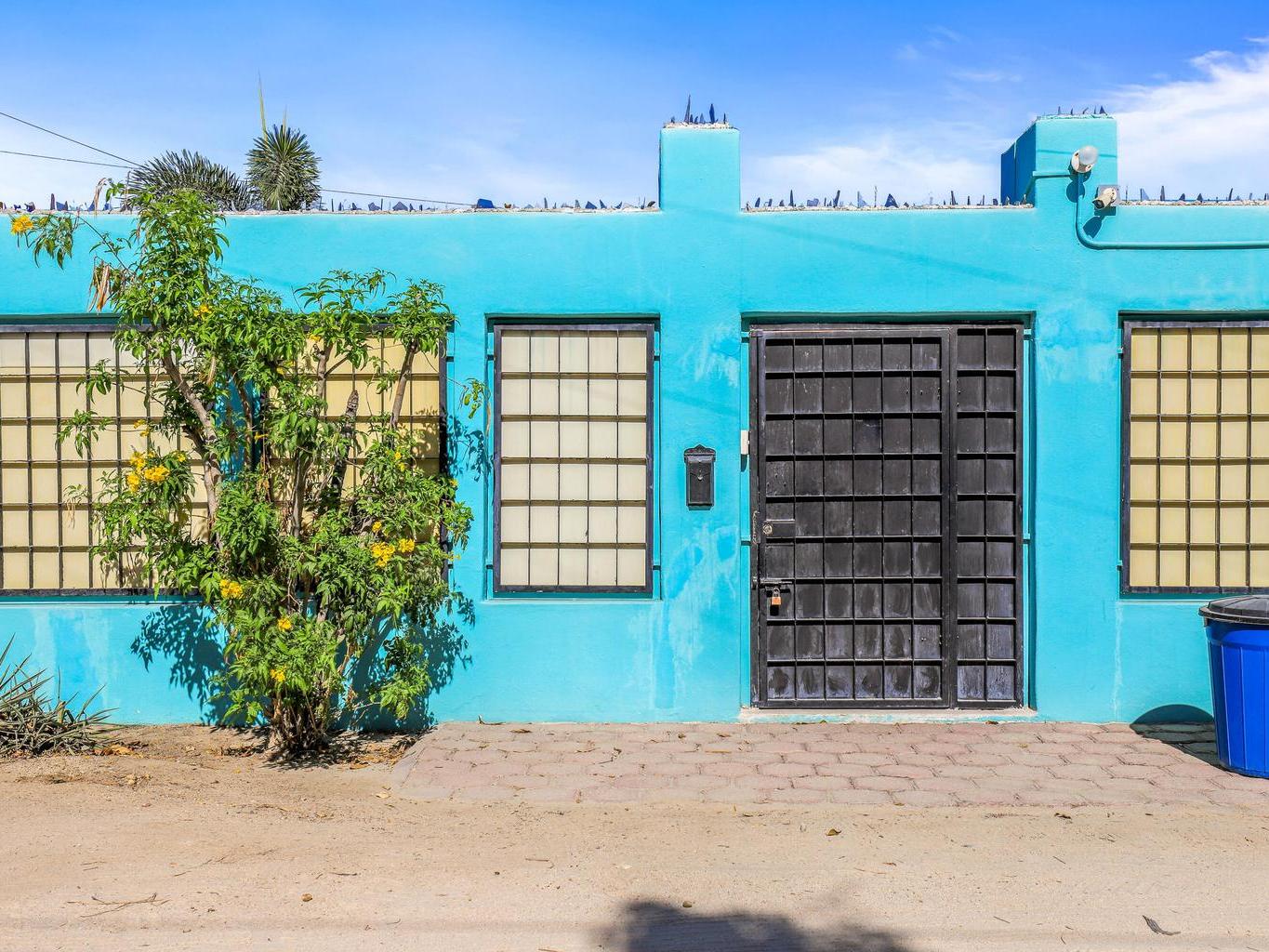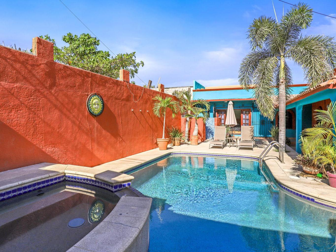 Tucked along a quiet dirt road in northern San José del Cabo, this colorful 4-bedroom, single-level home is ideal for rentals. Features include a detached room for office or guests, indoor and outdoor kitchens, pool, hot tub, outdoor shower, garage, and rooftop sitting area for relaxing and entertaining.