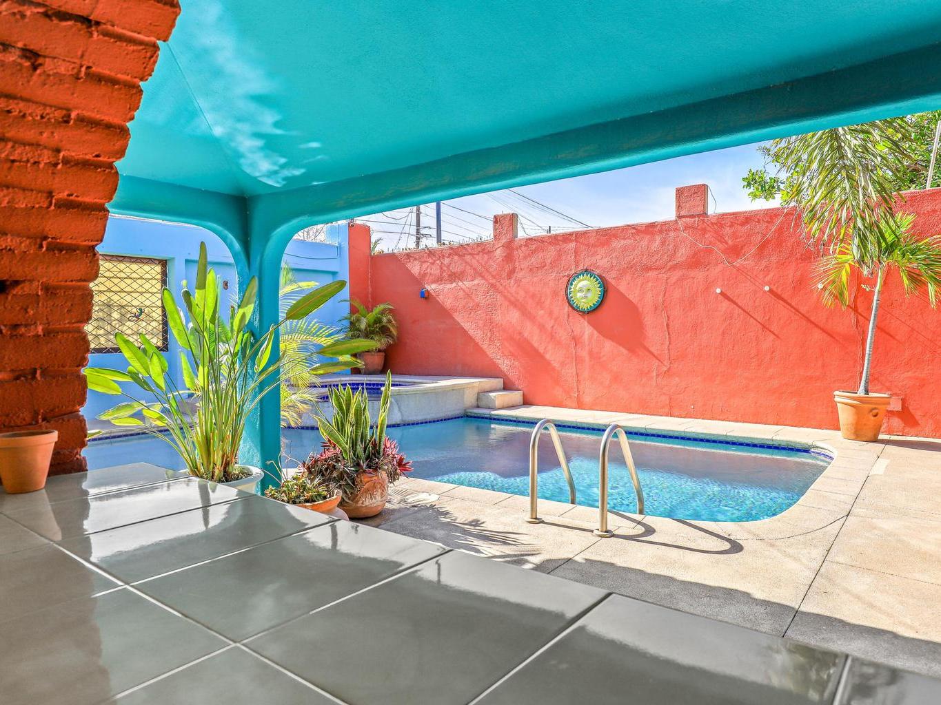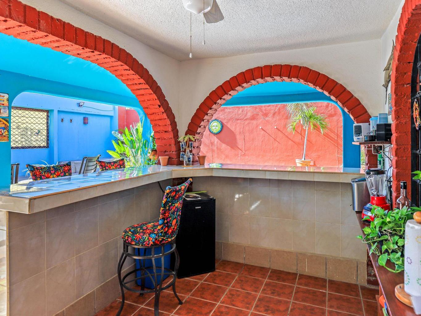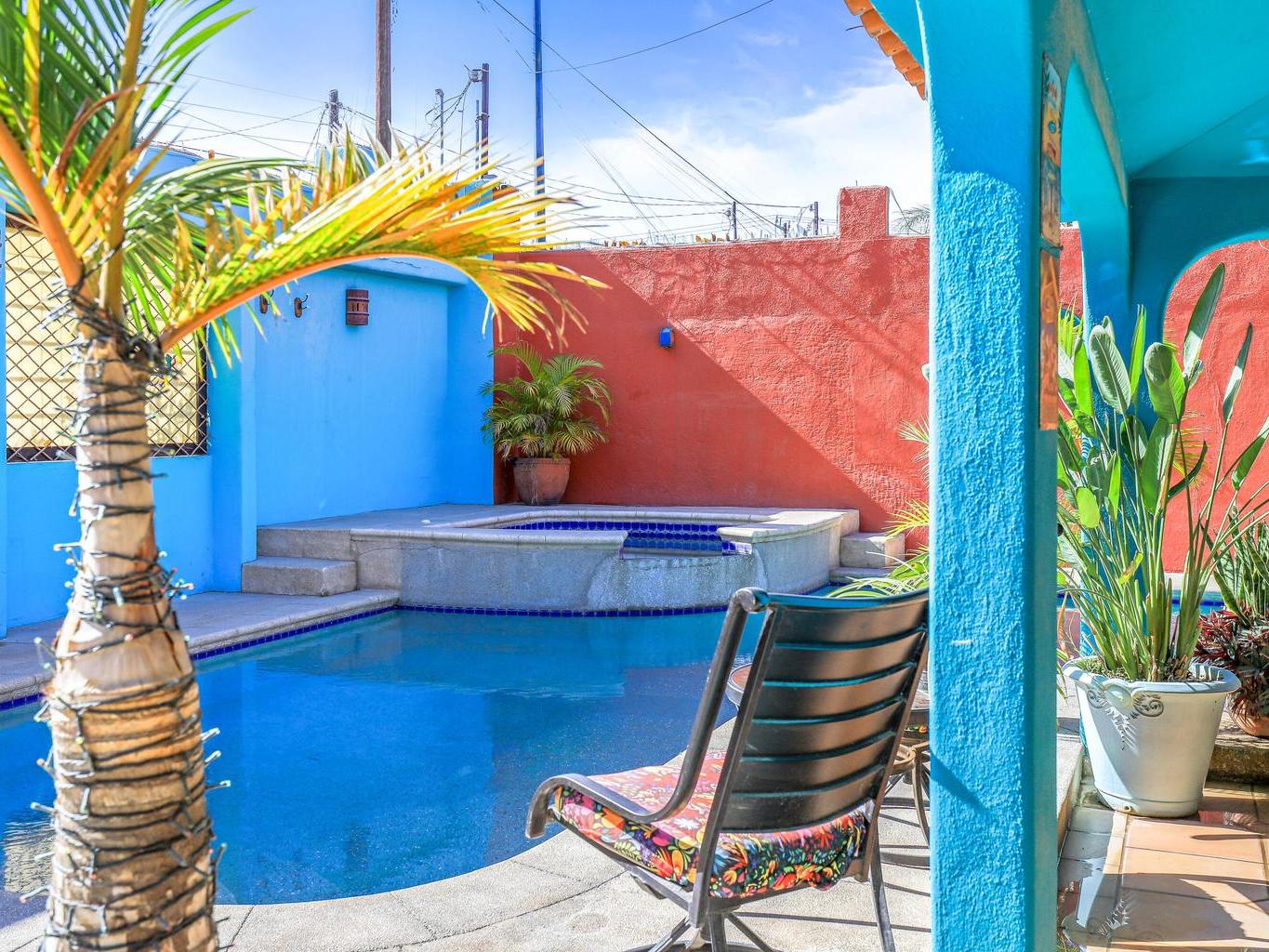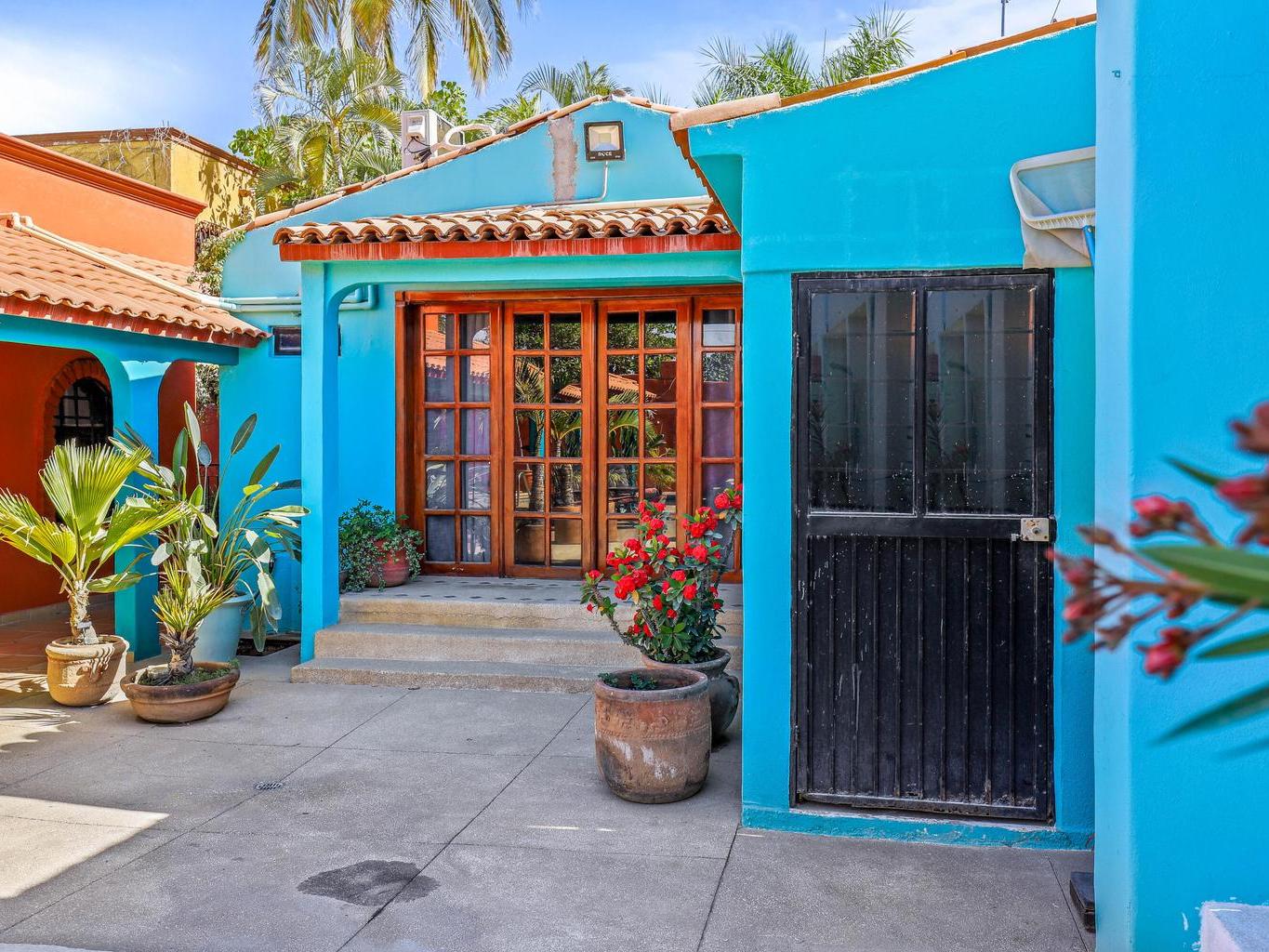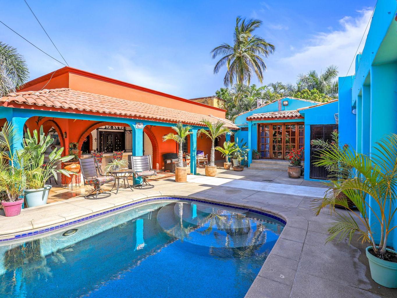 Tucked along a quiet dirt road in northern San José del Cabo, this colorful 4-bedroom, single-level home is ideal for rentals. Features include a detached room for office or guests, indoor and outdoor kitchens, pool, hot tub, outdoor shower, garage, and rooftop sitting area for relaxing and entertaining.